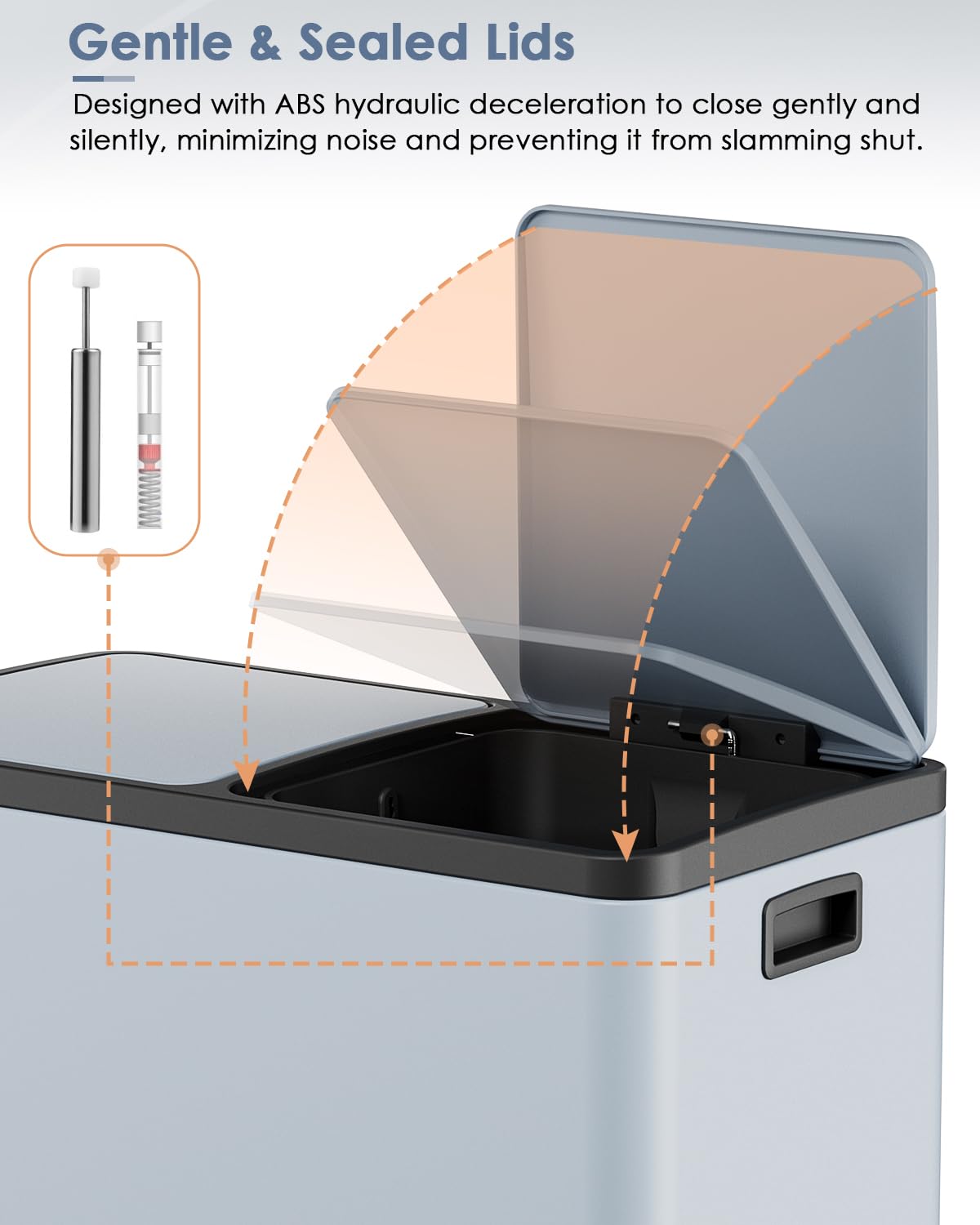 • GENTLE CLOSE: Lid of the trash can is designed with ABS deceleration, which effectively reduces the closing noise and does not make a popping sound, putting the trash can in the bedroom is also a good choice.