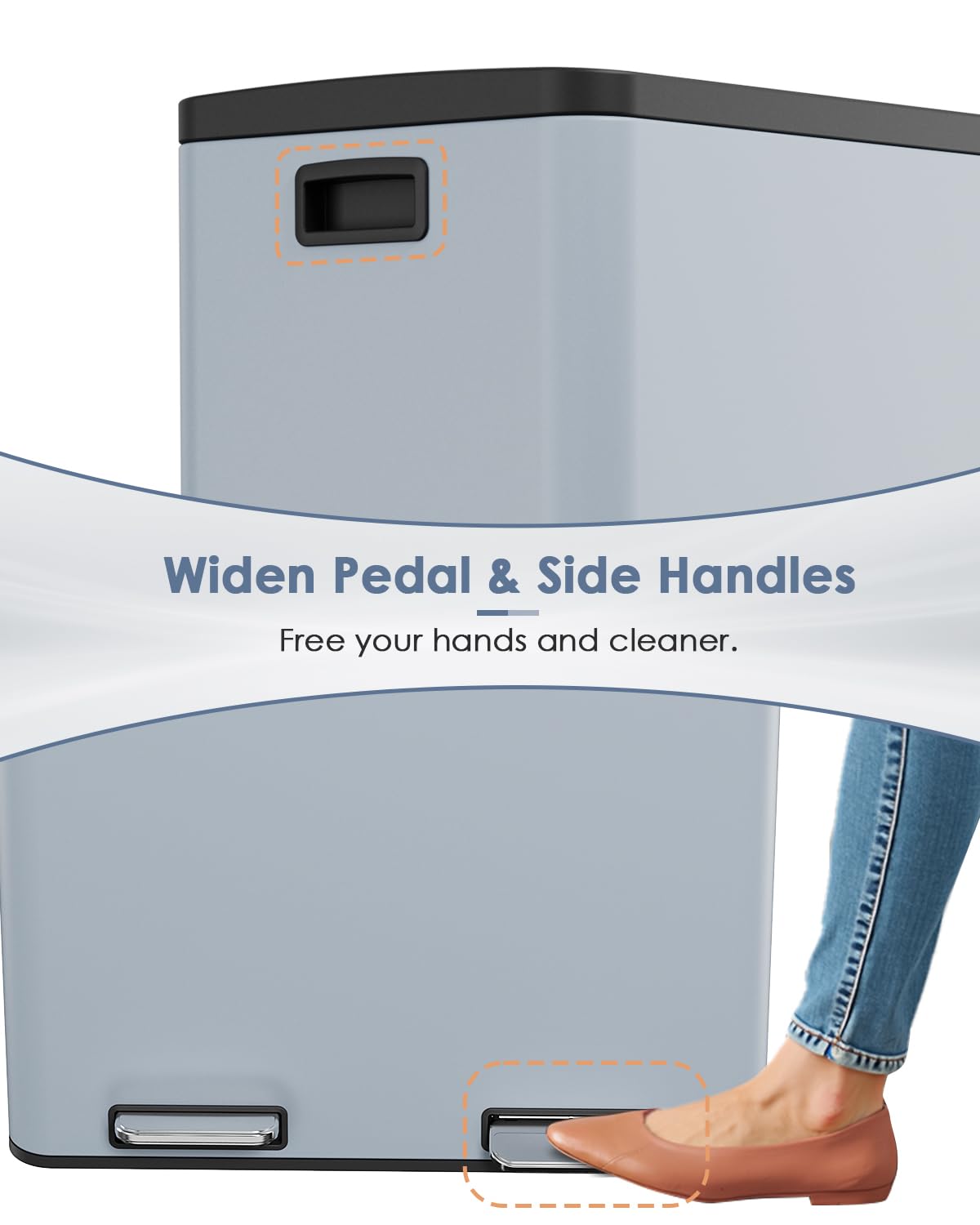 • THICK & WIDE PEDEL: Wide and thick stainless steel pedal is ergonomically designed, so you can throw out trash without bending over, and you don't need to touch the lid of the bucket when throwing out trash.