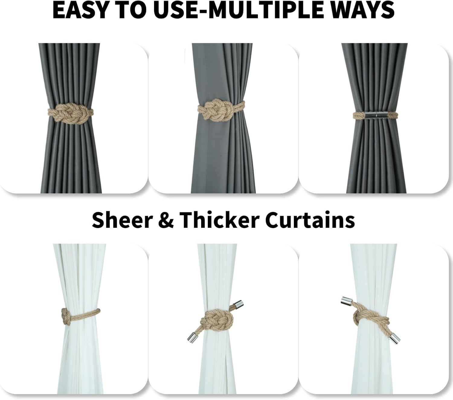 4 Pack Natural Jute Magnetic Curtain Tiebacks, Boho Rustic Style Decorative Curtain Ties Backs for Home & Office Drapery
