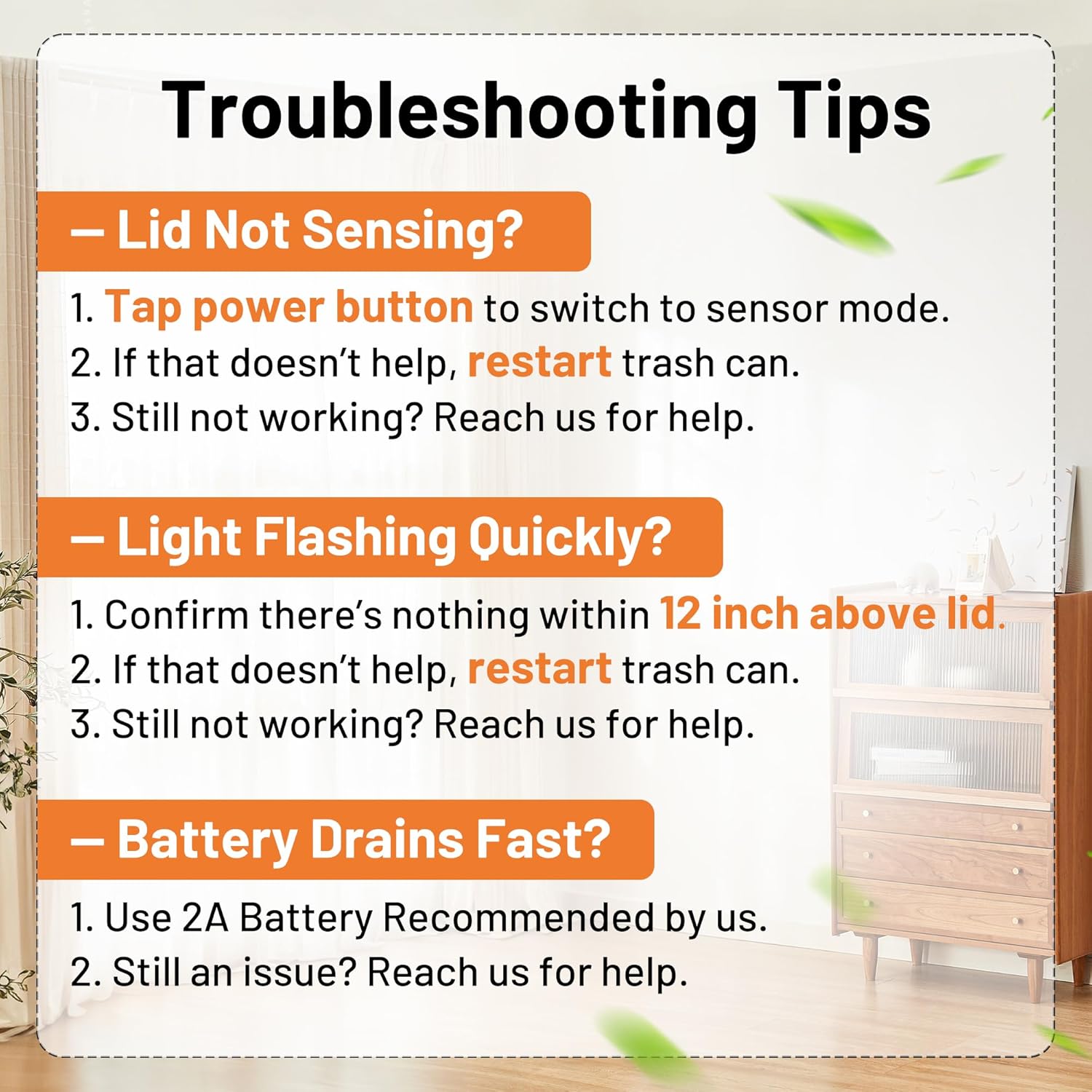 • 【CUSTOMER NOTICE】 The bathroom wastebasket requires two AA batteries (not included). Press and hold the switch to turn the power on/off. If the light flashes and the sensor does not work, you can try to turn off the power and restart the smart trash can.