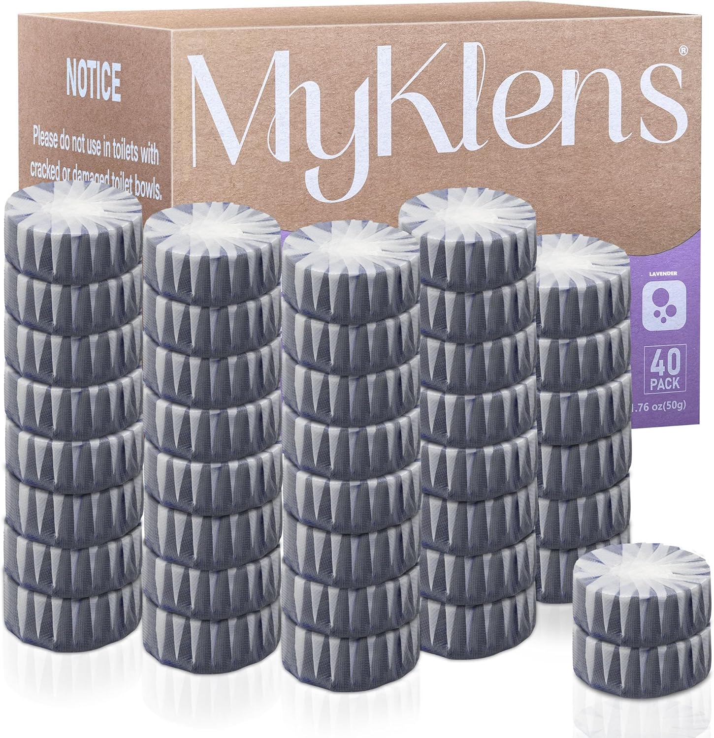 • Important Note: MyKlens toilet cleaner tablets can reduce the buildup of dirt in the toilet bowl, but are not replacement for toilet brush. Please clean the toilet bowl with a brush before the first time using our products. When the toilet bowl cleaner tablet dissolves completely and the BLUE/GREEN/PURPLE water turns transparent, please replace it with a new tablet.
