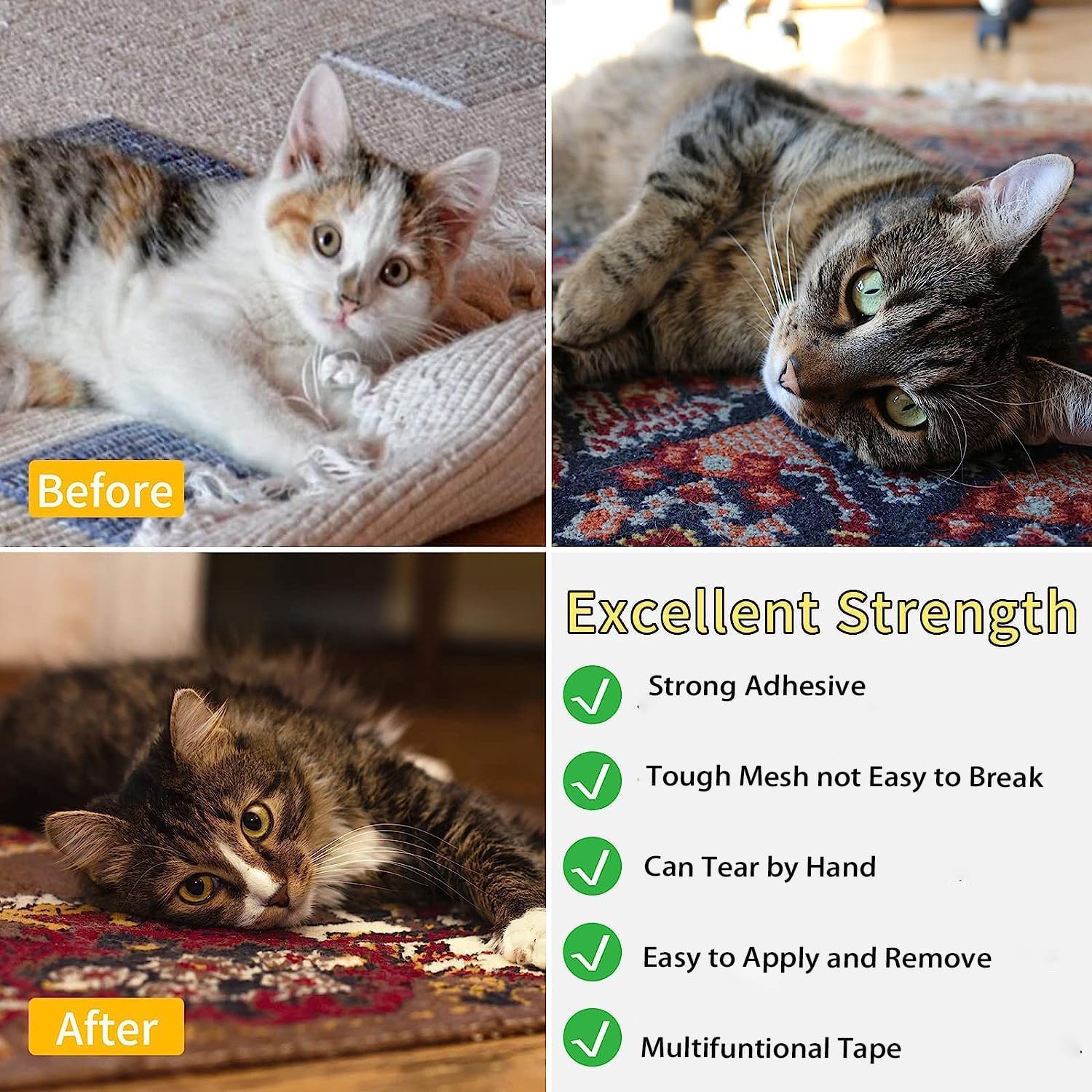 • RESIDUE FREE, EASY TO CLEAN- Double sided mesh tape coats high adhesion glue to strong fiber grid, leaves no annoying glue or residue when taking it off. The adhesive will not peel back up, causes no trouble in cleaning. Strong double sided tape keeps carpets or other objects firmly held in place. If you need to pull up clear carpet tape to reposition it or clean up, removable rug tape is very easy to be taken off.