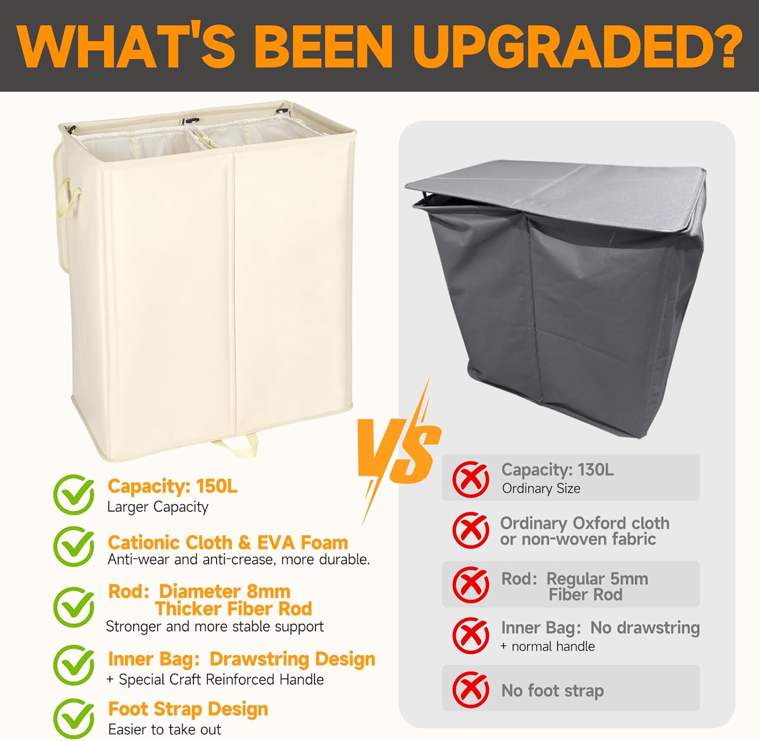 • 【Size Upgrade】The double compartment clothes basket measures 24x 13.4 x 28in with a huge capacity of 150L, which can hold 4 loads of laundry, and each compartment is 75L which can hold 2 loads of laundry individually