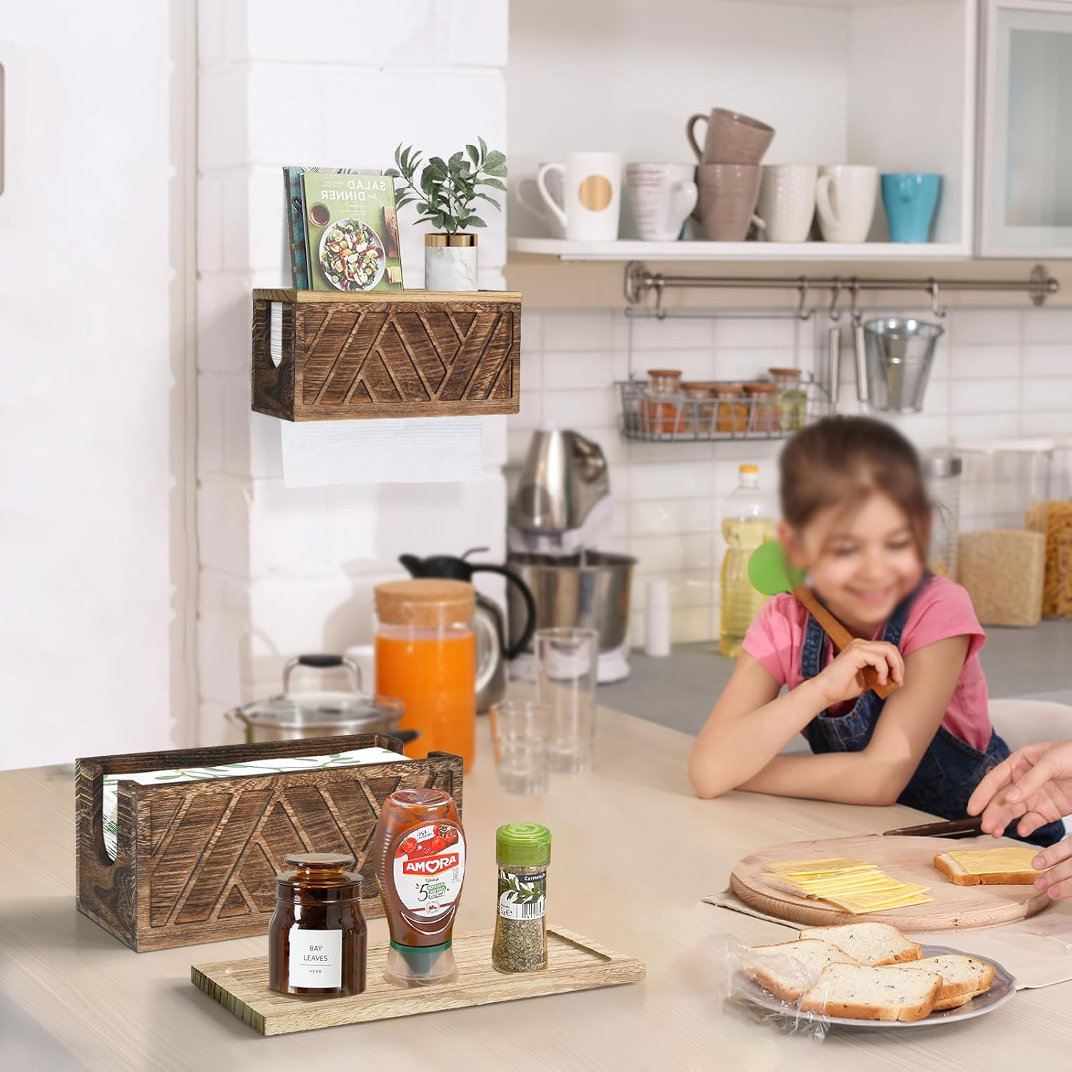 • ✨【Sturdy & Durable Paper Towel Dispenser】This farmhouse paper towel holder wall mounted is built with excellent quality 100% natural solid wood. Food grade safety coating, harmless and odor-free, safety enough to store c-fold, z-fold, trifold hand towel, paper towel, napkin for kitchen, bathroom and living room. Our utensil holder organizer is durable and will last for a lifetime.