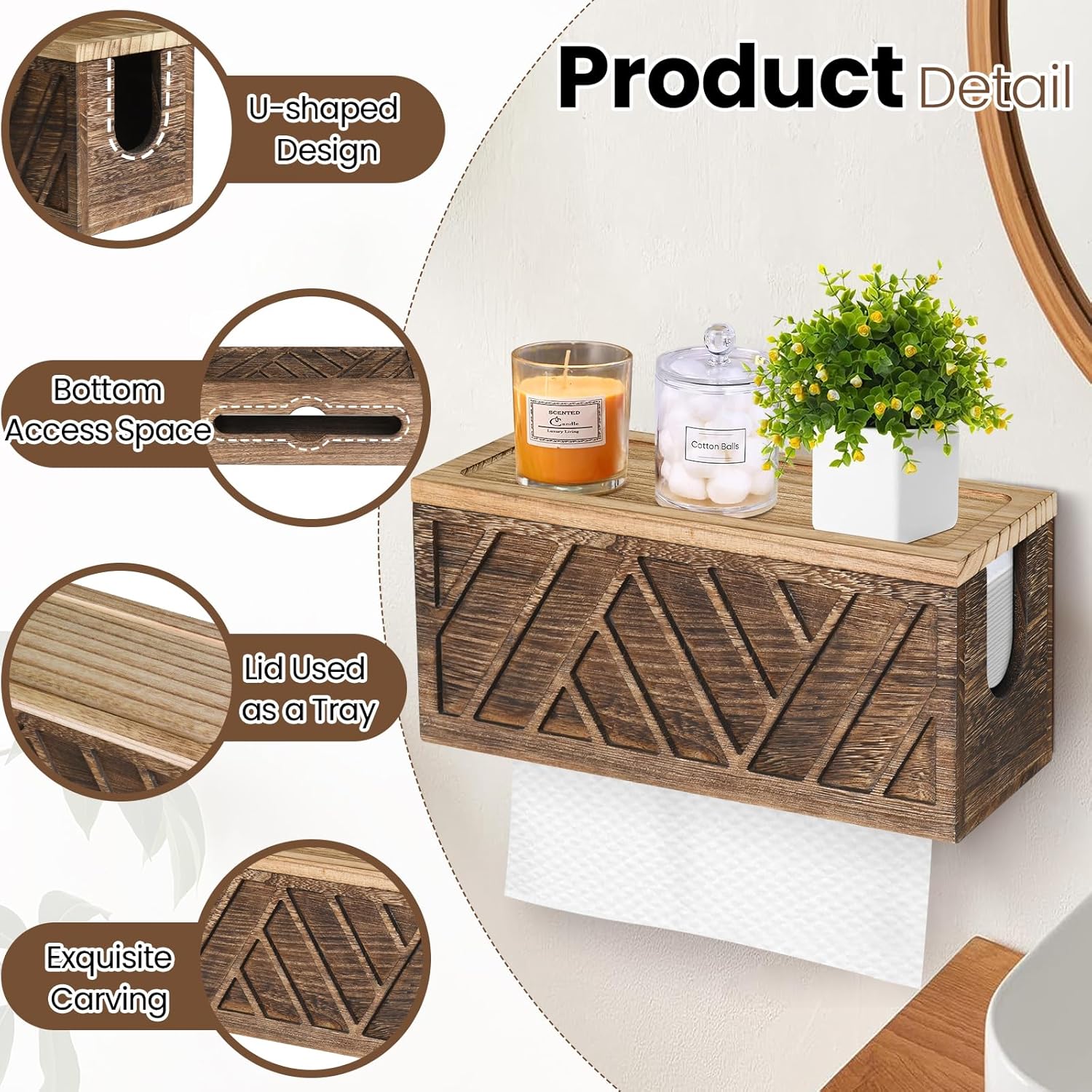 • ✨【Practical Paper Towel Holder for Farmhouse Decor】Our bathroom napkin dispenser is practical and beautiful. With wide and smooth opening bottom, our wall mount paper towel holder helps you easily access to the towel paper you need. In addition, the brown lid, exquisite carving, and dark brown appearance of the bathroom paper towel holder adds a rustic home decor to the room.Whether on display on your countertop, or hang on your home wall, the bathroom paper towel holder is an eye-catching focus.
