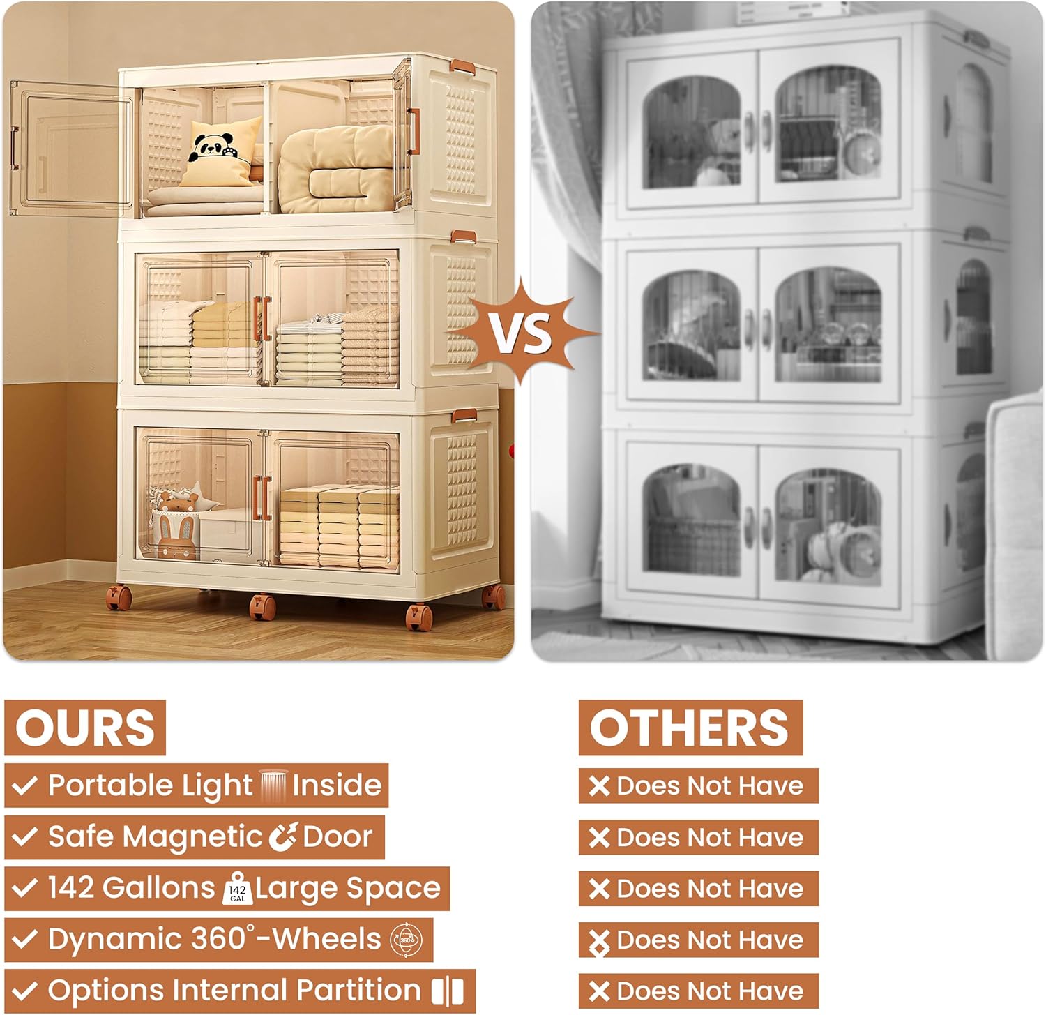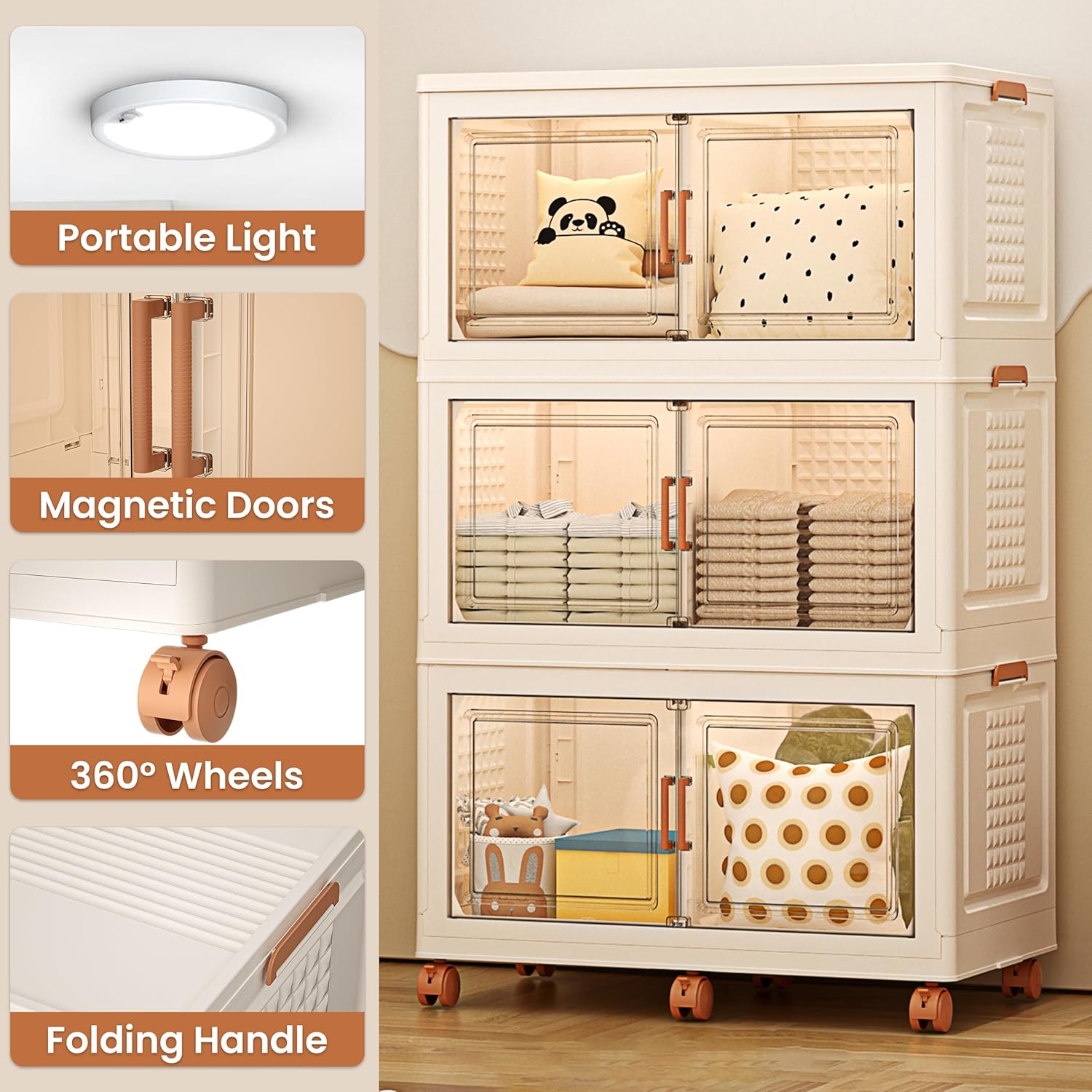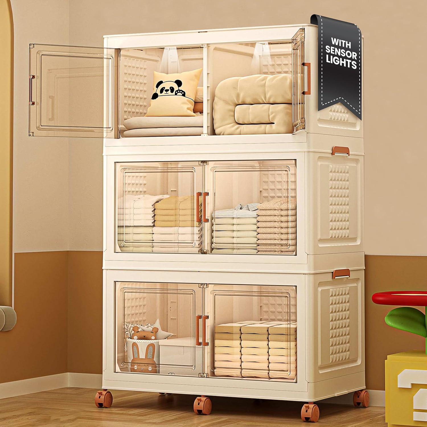 568QT/141Gal 3 Layer Stackable Storage Bins with Lid & Doors - Sensor Lights, Collapsible Storage Bin with 6 Wheels, Plastic Foldable Organizer for Home, Office Use