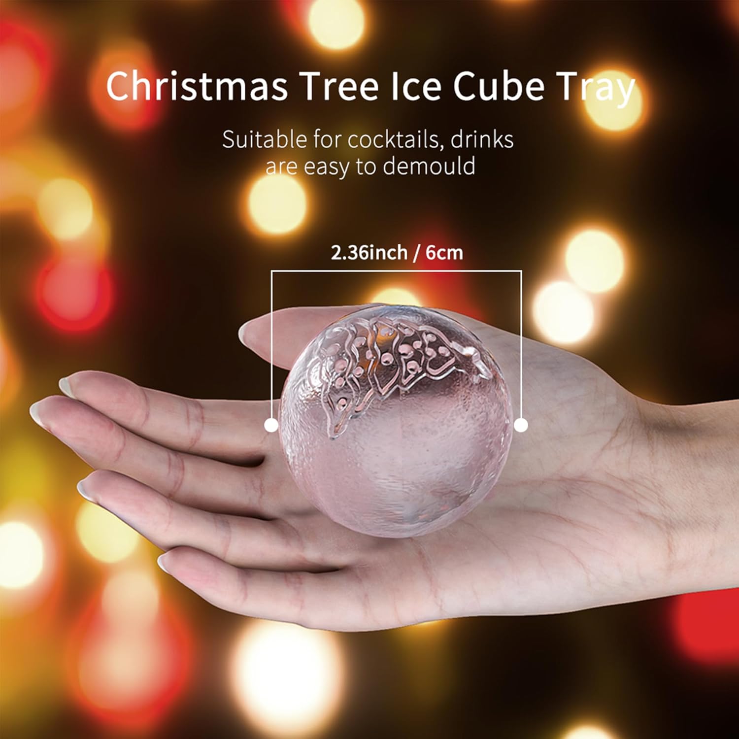 • 2.36" Large Christmas Ornament Ice Cube Mold - ACOOKEE Christmas Snowflake Tree ice molds create TWO 2.4 inch sphere ball ices rocks with detailed Christmas Tree & Snowflake pattern at one time.