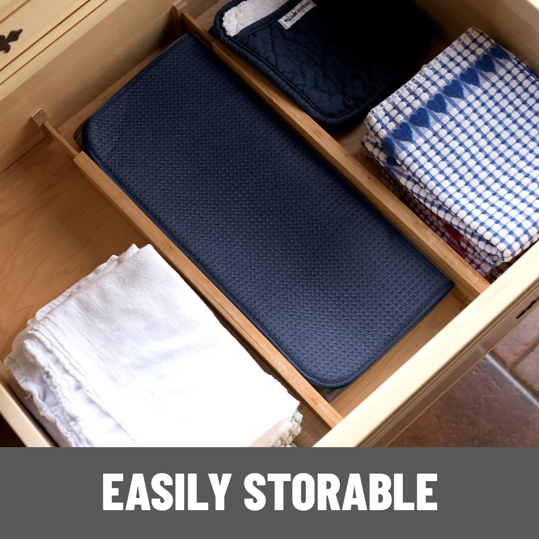 • THICKEST , STYLISH MAT | INNOVATIVE HONEYCOMB WEAVE: Keep your counter spotless even while washing a sink full of kitchen dishes . Our superbly stylish drying mat is among the thickest on the market today , and its innovative honeycomb microfiber structure enhances absorption and quickens drying time . Idea kitchen accessories for countertop