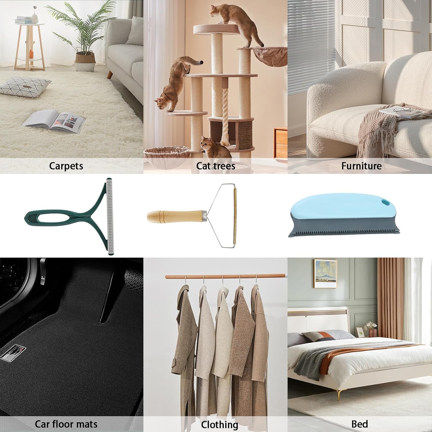 • 【THREE SHAPES FOR DIFFERENT SCENARIOS】pet hair remover 5-piece set contains three different shapes, all ergonomic, comfortable and convenient to hold. The plastic handle can be used in carpets, sofas, cat trees, all kinds of furniture and other heavy items; the wooden handle is suitable for lighter and softer materials: such as bed sheets, light clothes, etc. The blue handle of the pet hair remover contains a double row of combs, which can clean the hair with less effort.