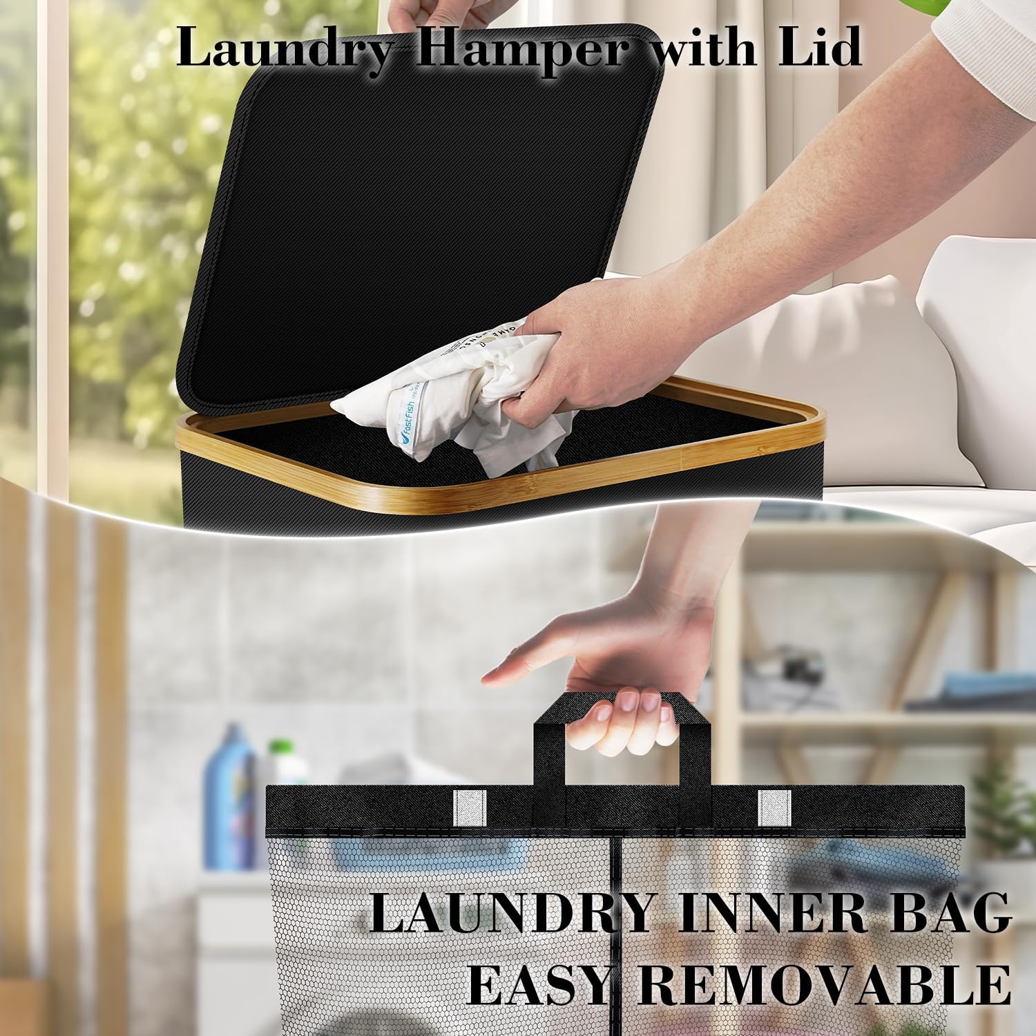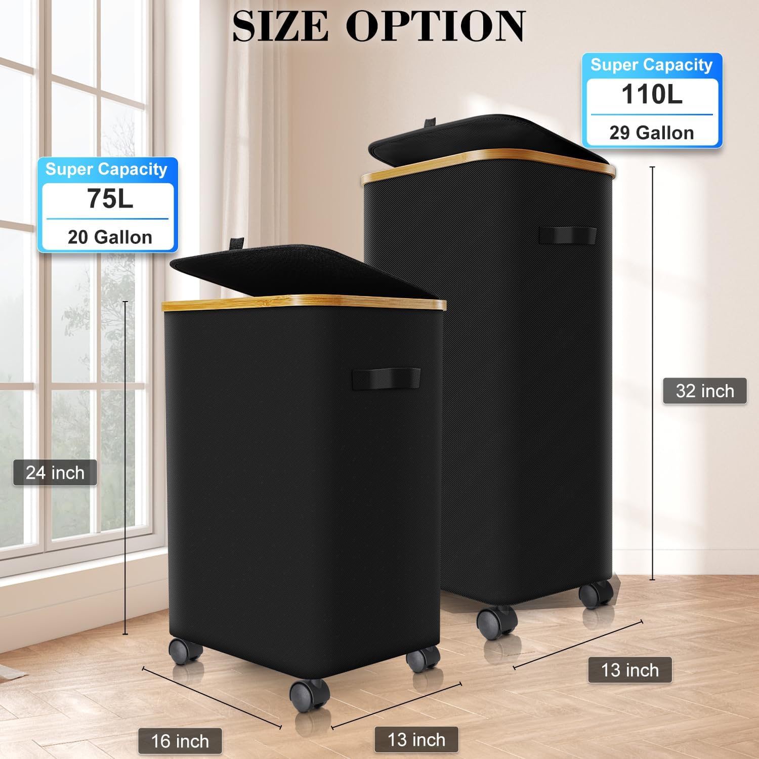 Laundry Hamper with Wheels,20 Gal (75L) Laundry Basket with lid Rolling Clothes Hamper Foldable Dirty Clothes Basket on wheels with Bamboo Frame and Bag for Bedroom, Dorm, Laundry Room-Black