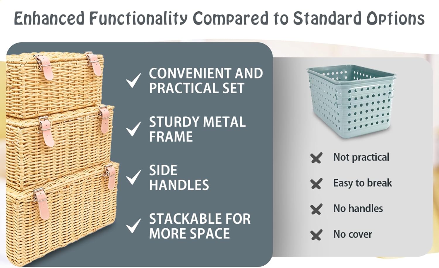 • A Chic Touch for Home Decor: Not only are space-saving thanks to their stackable lidded design but also modern and stylish! Featuring a natural color and beautiful craftsmanship, our woven storage baskets adorn your space with a boho touch while keeping everything organized and out of sight!