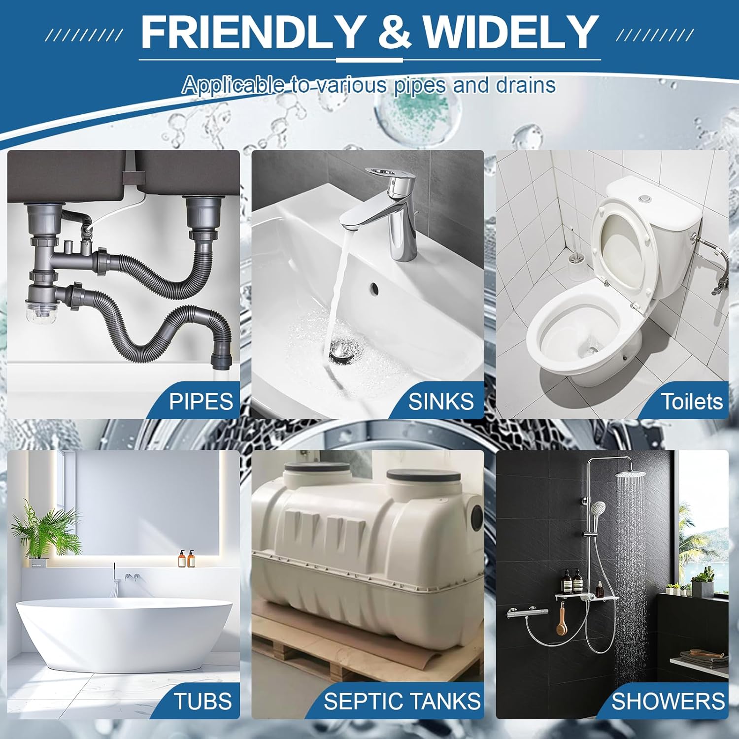 • Versatile and Powerful: Suitable for kitchen sink, bathroom, and toilet drains, bathtub, showers, floor drains, urinals, RV drains, and more, this drain cleaner is effective on a variety of common blockages. Whether it's stubborn grease in the kitchen or hair buildup in the shower, it tackles it all