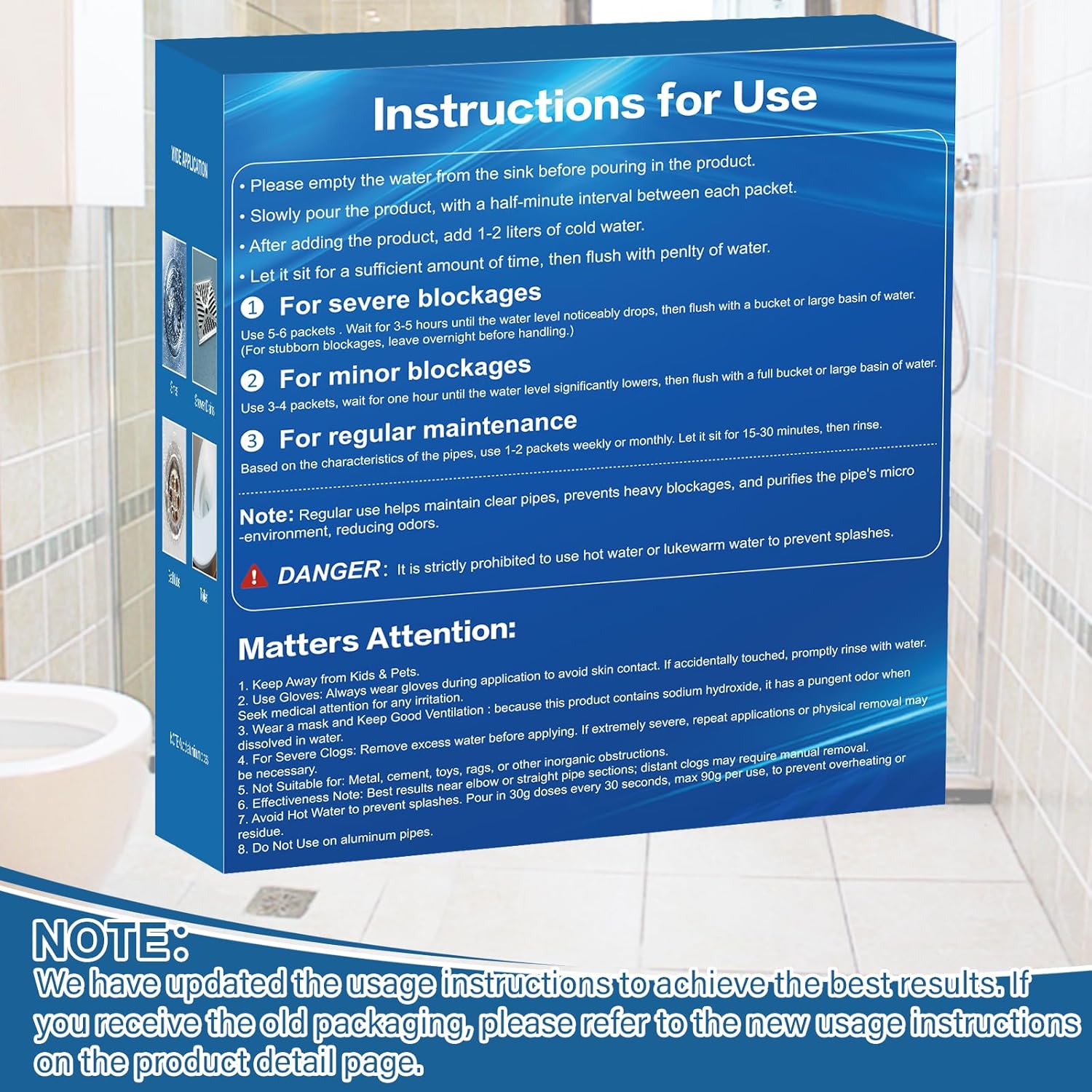 • Easy to Use: Individually wrapped. Simply pour the drain clog remover into the clogged drain, allow it to sit for the recommended time, and then flush with cold water. No complicated tools or procedures needed—just pour, wait, and rinse
