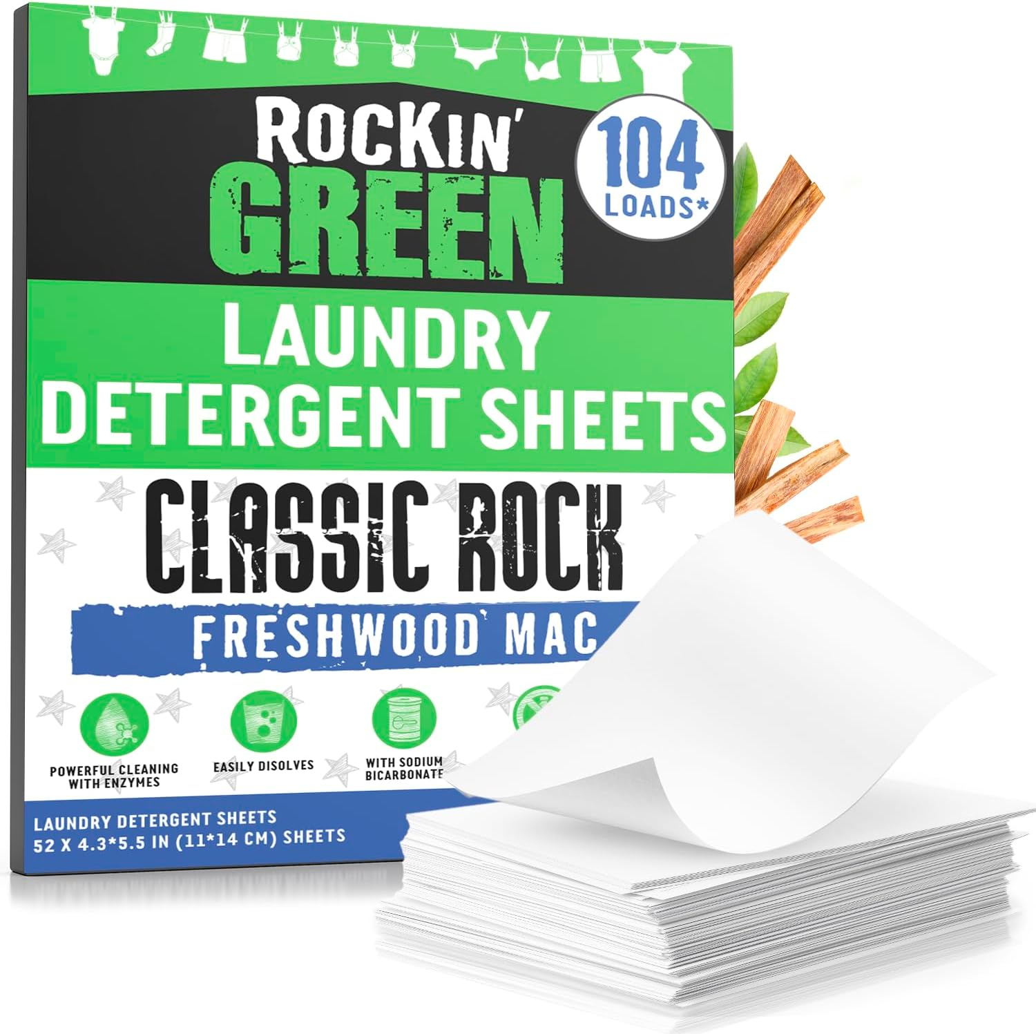 Rockin' Green Travel Laundry Detergent Sheets - Mess-Free Laundry Sheets Detergent Powerful Cleaning with Sodium Bicarbonate - Easily Dissolvable Laundry Soap Sheet (104 Loads, Freshwood Mac)