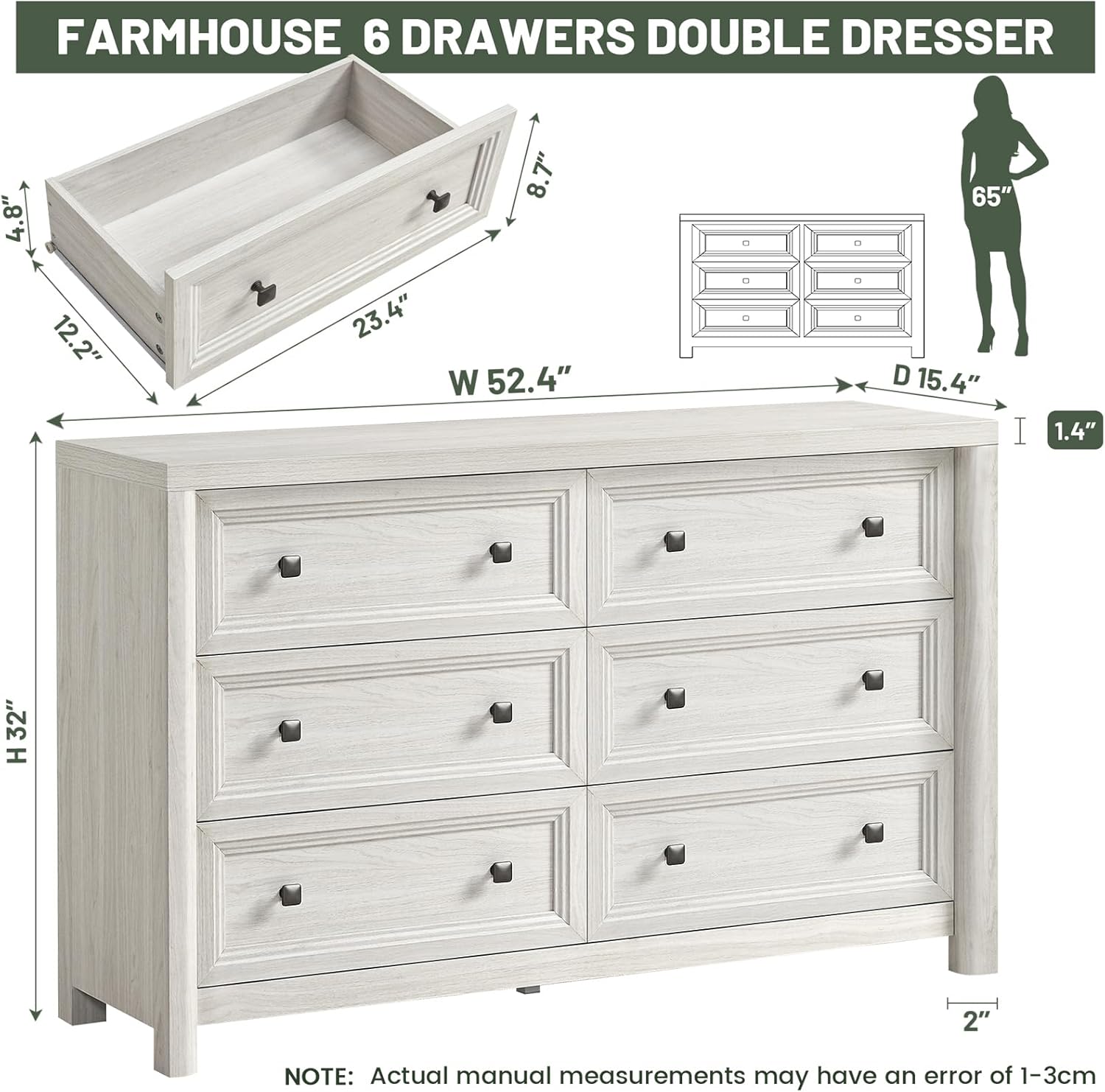 Farmhouse 6 Drawers Dresser for Bedroom, White Dressers, 52" Wide Rustic Wood Chest of Drawers with Natural Texture, Metal Handle, Storage Closet Dressers for Bedroom, Living Room