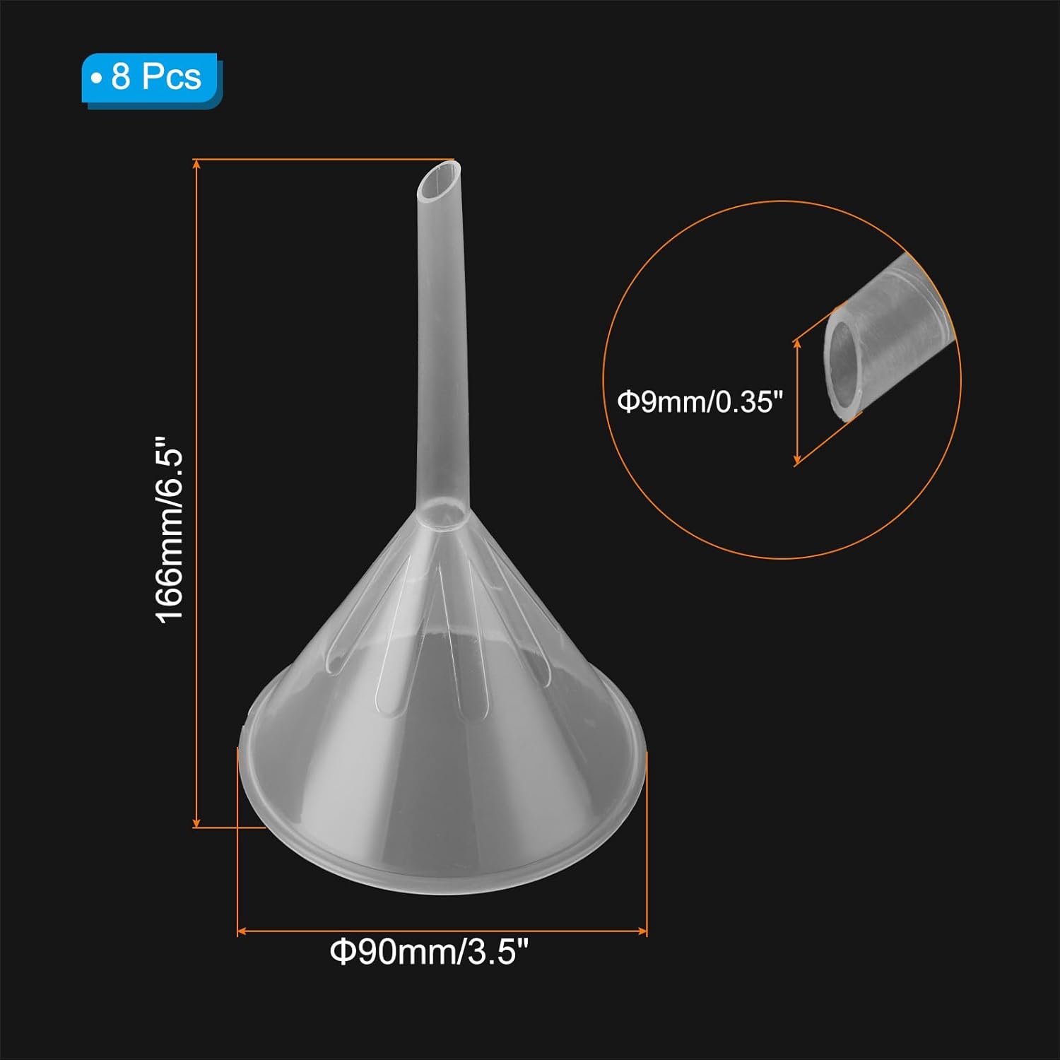 • Color: Clear; Material: PP Plastic; Top Opening Dia: 90mm / 3.5 inch; Outlet Dia: 9mm / 0.35 inch; Length: 166mm / 6.5 inch; Packing List: 8 x Clear Plastic Funnel