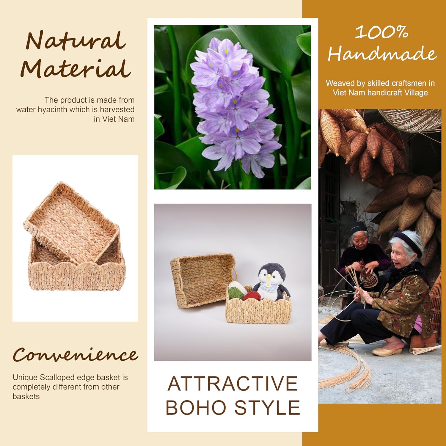 • 🎯 【Detail】: Wicker storage basket is handmade by skilled craftsmen using material natural water hyacinth, so each scalloped edge basket with built-in handles is unique. The woven basket strong and built to last, so that they'll keep their shape and stay reliable over time, making them even more valuable.