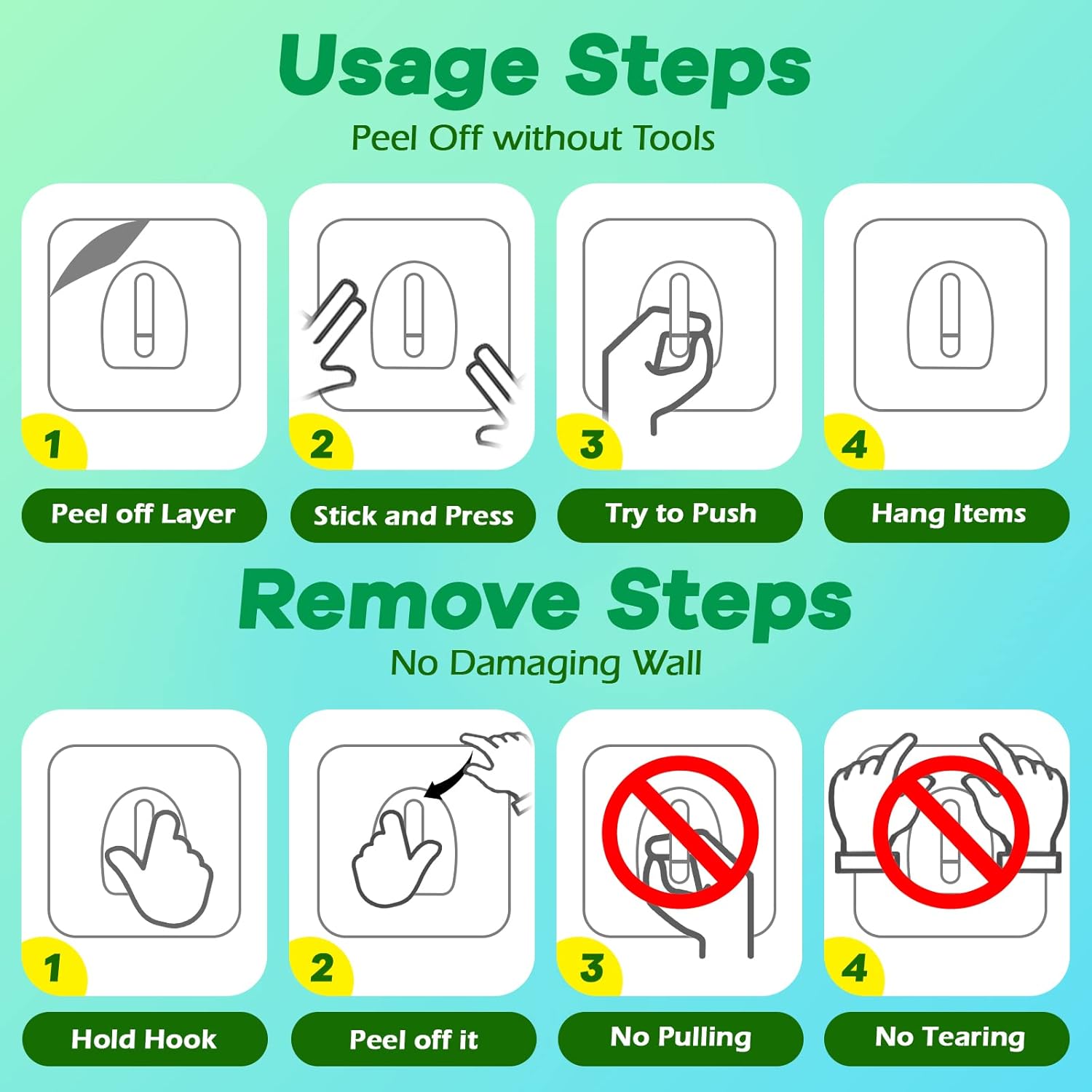 • 【Easy to Install & Remove】 Our Sticky Hook is very easy to istall. Just clean and dry the surface, stick the hook onto the wall surface, and then squeeze all the air bubble out. Easy to clean and re-position without surface damage. When removing the hooks, no any traces or damage to the wall. Reuse many times until the hooks lose its adhesive.(please use hair dryer, do not wipe with paper or towels)