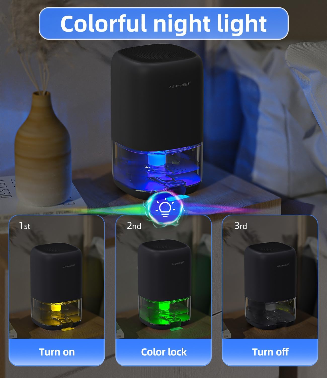 • Quiet Dehumidifiers with 7 Color Light: Simply press the light button and you can see 7-color romantic atmosphere lights, and the ultra-quiet operation(28 dB), perfect for office or sleeping environments.