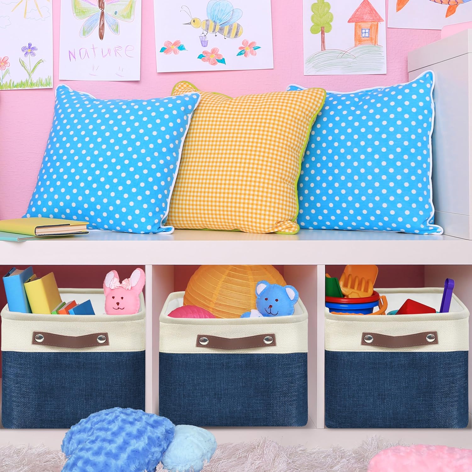 SIMPLE HOUSEWARE Large Fabric Storage Bin, 15" x 11" with Leather Like Handles, 3 Pack, Steel Blue