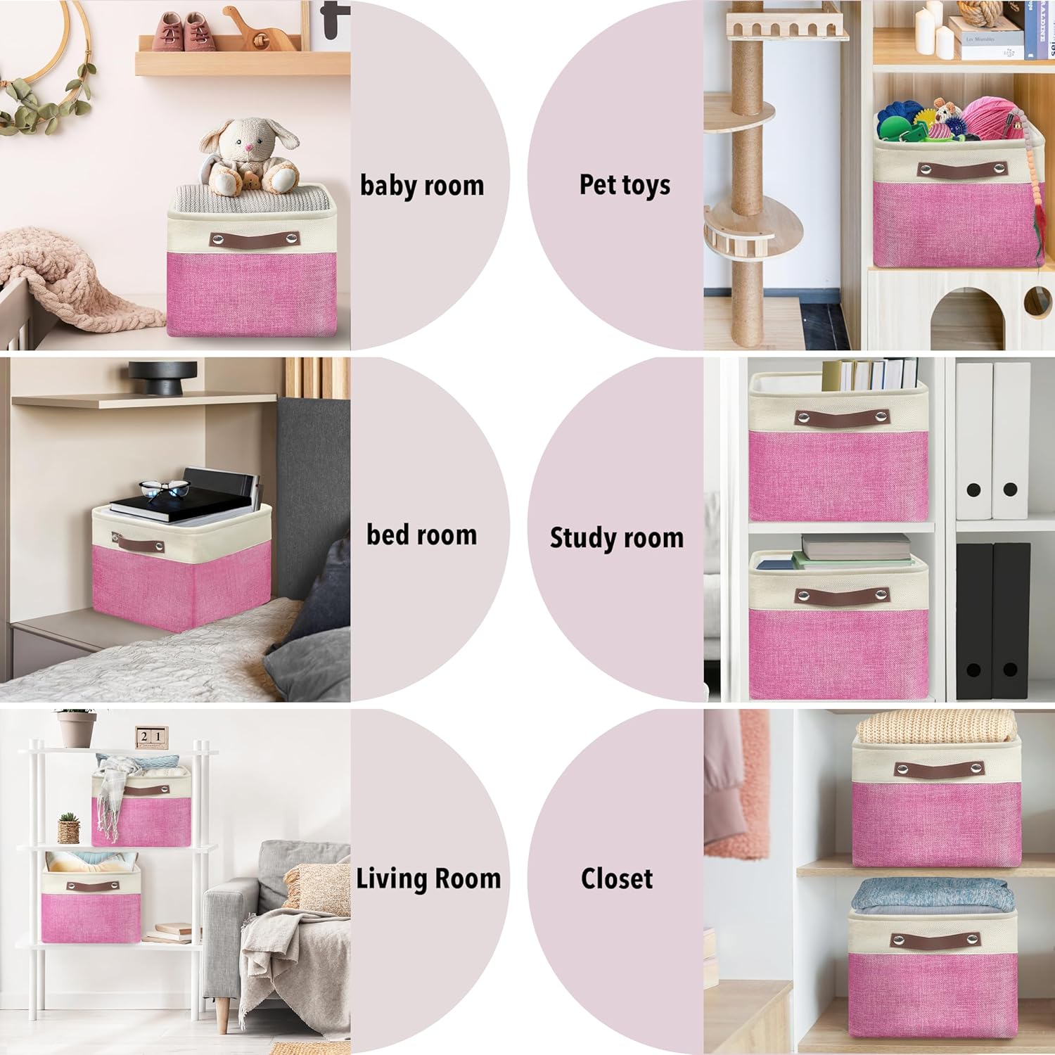 SIMPLE HOUSEWARE Large Fabric Storage Bin, 15" x 11" with Leather Like Handles, 3 Pack, Pink