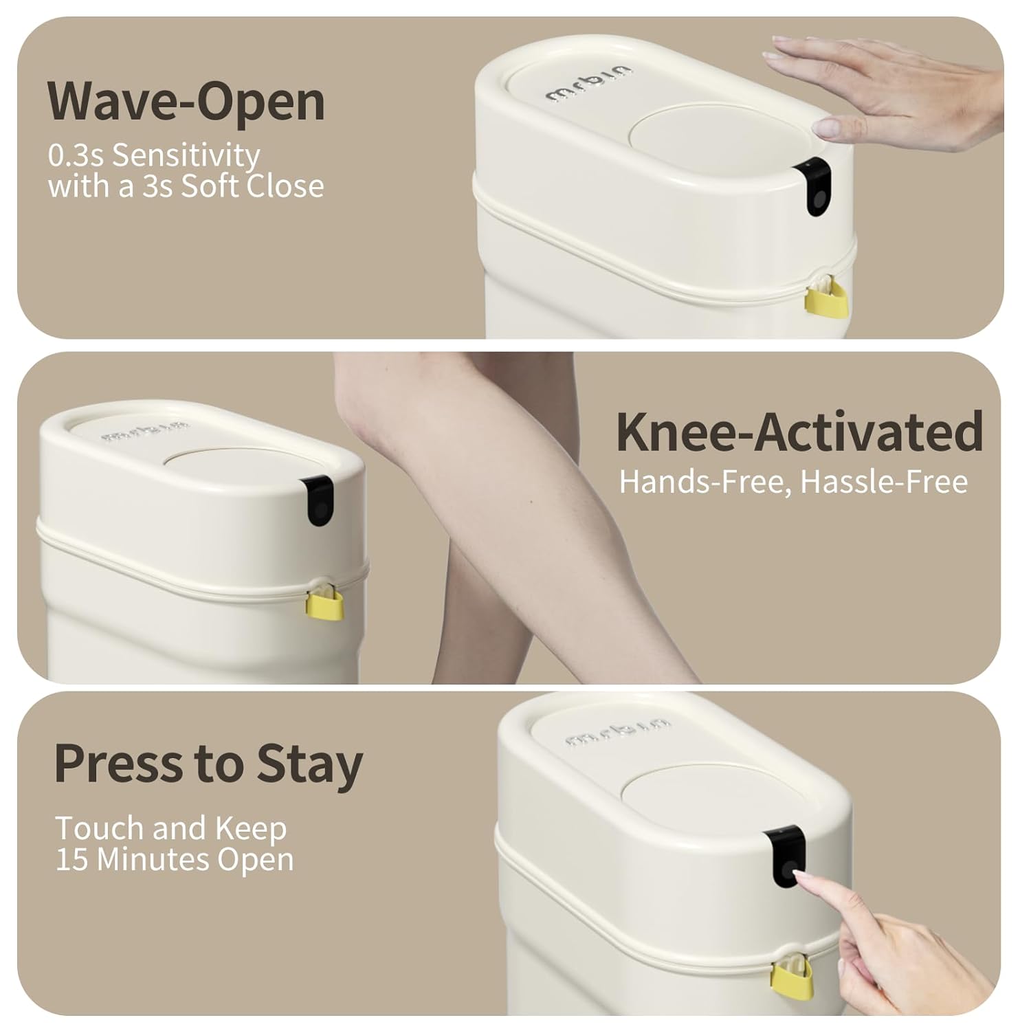 • Three-Way Motion Sensor Opener: The white bathroom trash can is equipped with a motion sensor that opens the lid in just 0.3 seconds. With sensors for waving, knee-nudged motion, and a Home button, it offers three convenient ways to access the waste bin quickly and easily.