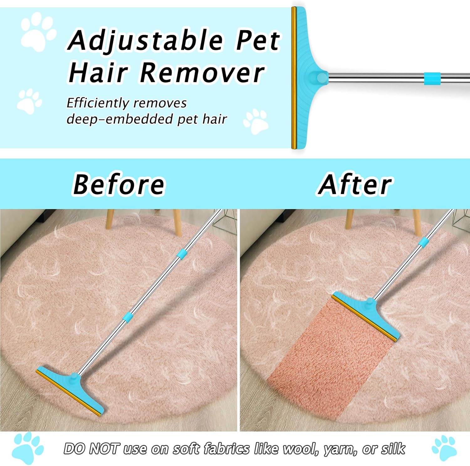 • Effectively Clean Embedded Pet Hair - The handle of the dog hair remover is made of 4 durable stainless aluminum sections, Length adjusts from 16.5 to 60 inches fits different heights and protect your back. The long adjustable handle dog fur remover reaches deep into the carpet, easy to reach under sofas and hygienic corners removes all of your beloved pet's hair.The Y-shaped cat fur remover designed to fit more scenarios