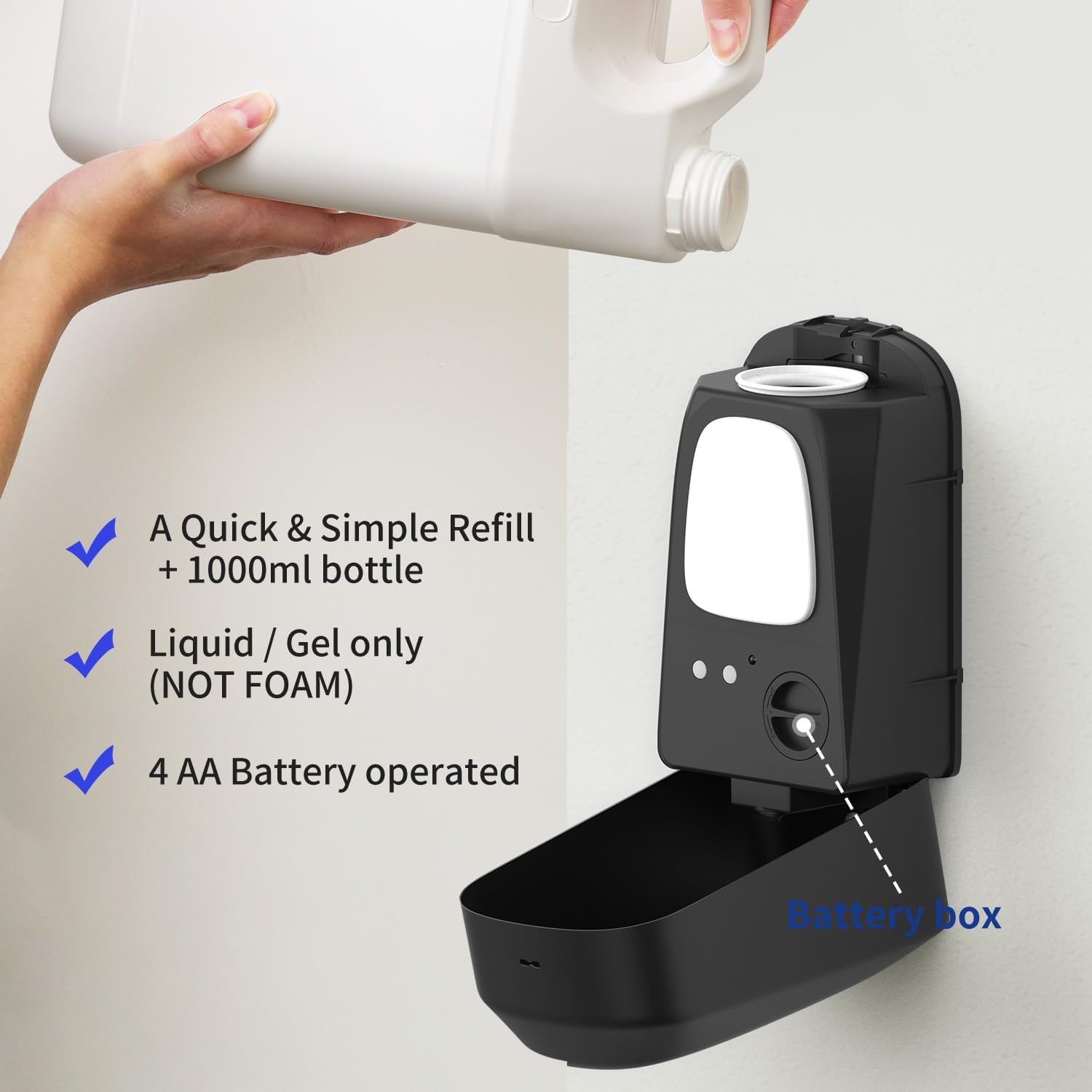 • Simple Setup: This dispenser requires 4 AA batteries, which can typically last for three months with regular use
