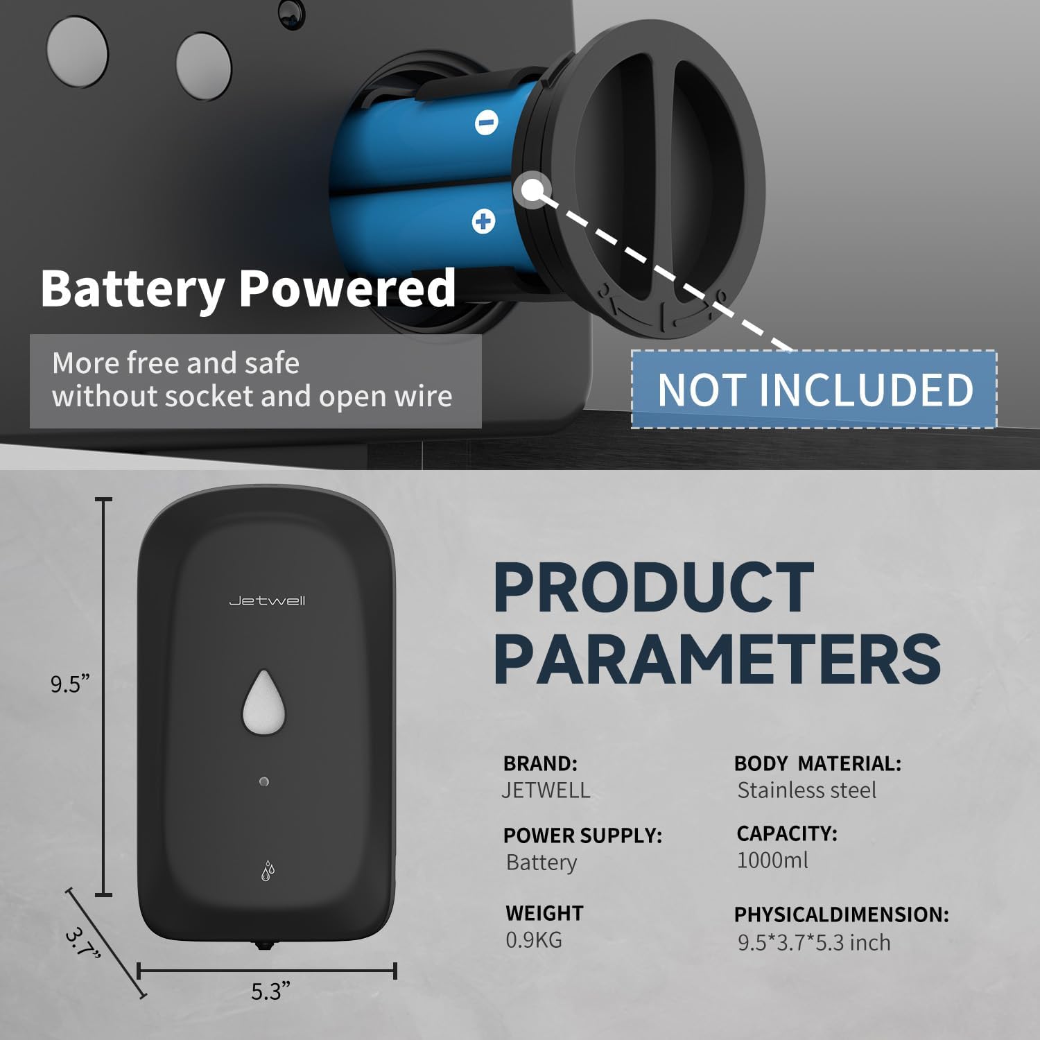 JETWELL Automatic Touch-Less Wall Mount Hand Soap Dispenser Liquid Drop Battery Operated, Black Matte Stainless Steel Cover Large Capacity 34OZ/1000ML for Kitchen Home Commercial Bathroom