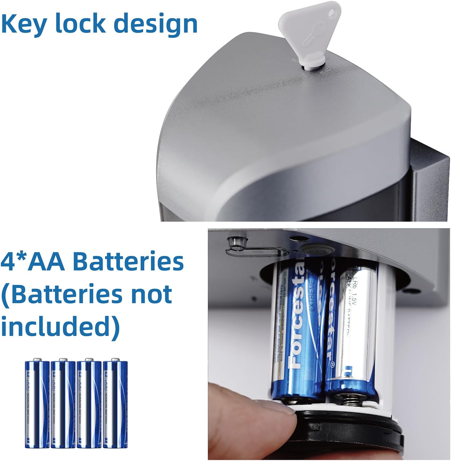 • 3-Level Adjustable Soap Output Volume: Our automatic soap dispenser has 3 different liquid soap volume settings, which allows you to set your desired volume easily. Long press the button at the bottom of the hand soap dispenser to switch power on/off, and short press to switch the soap level. This sensor soap dispenser pump uses 4 AA Alkaline batteries (batteries not included).