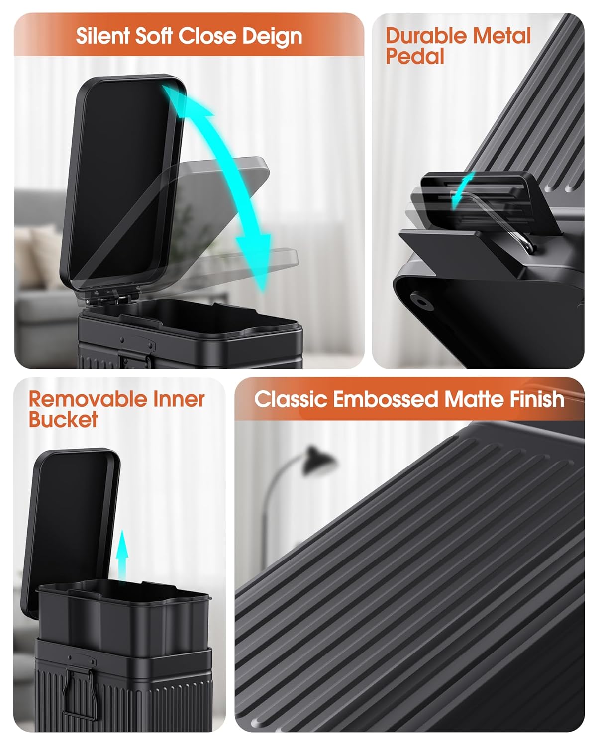 • Removable Inner Bucket: Our trash cans feature a removable inner bucket that makes trash disposal easy; There is a carry handle on the back of the slim trash can to move it easier