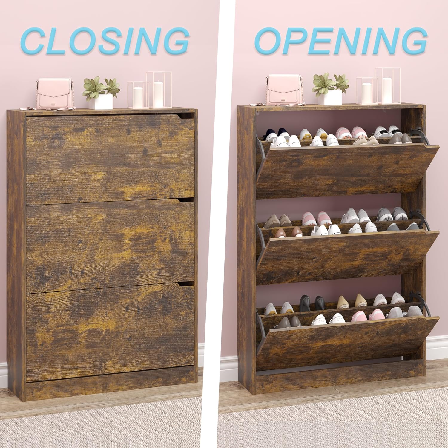 • 【Adjustable panel shoe cabinet】:The 3 flip drawers,There are two upper and lower drawers, each drawer contains 2 tiers of storage space. The panel can be adjusted or removed in two grooves to accommodate different heights and sizes of flats, mid boots or heels! on the top, ideal for placing potted plants, ornaments, socks and keys.