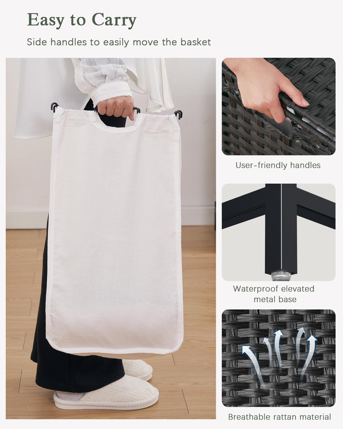 • Metal Heightened Feet: The bottom of wicker laundry hamper is designed with 3.34 "metal rust-proof high feet to prevent clothes from getting wet and causing unpleasant odors. Wicker basket with lid comes with silicone foot pads to prevent damage to the floor