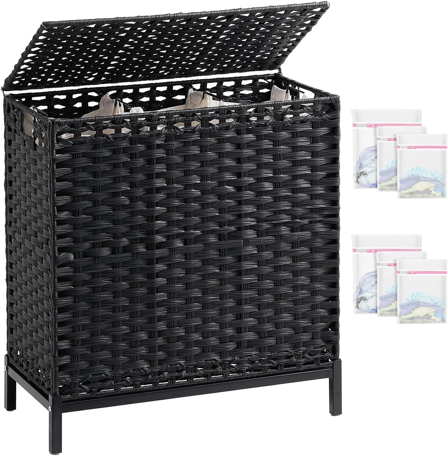 • Included Components : Accessories Bag × 1, Laundry Mesh Bags x 6, Metal Heightened Feet × 1, Separate and Removable Polyester Cotton Liner Bags × 3, Woven Laundry Hamper with Lid × 1 Accessories Bag × 1, Laundry Mesh Bags x 6, Metal Heightened Feet × 1, Separate and Removable Polyester Cotton Liner Bags × 3, Woven Laundry… See more