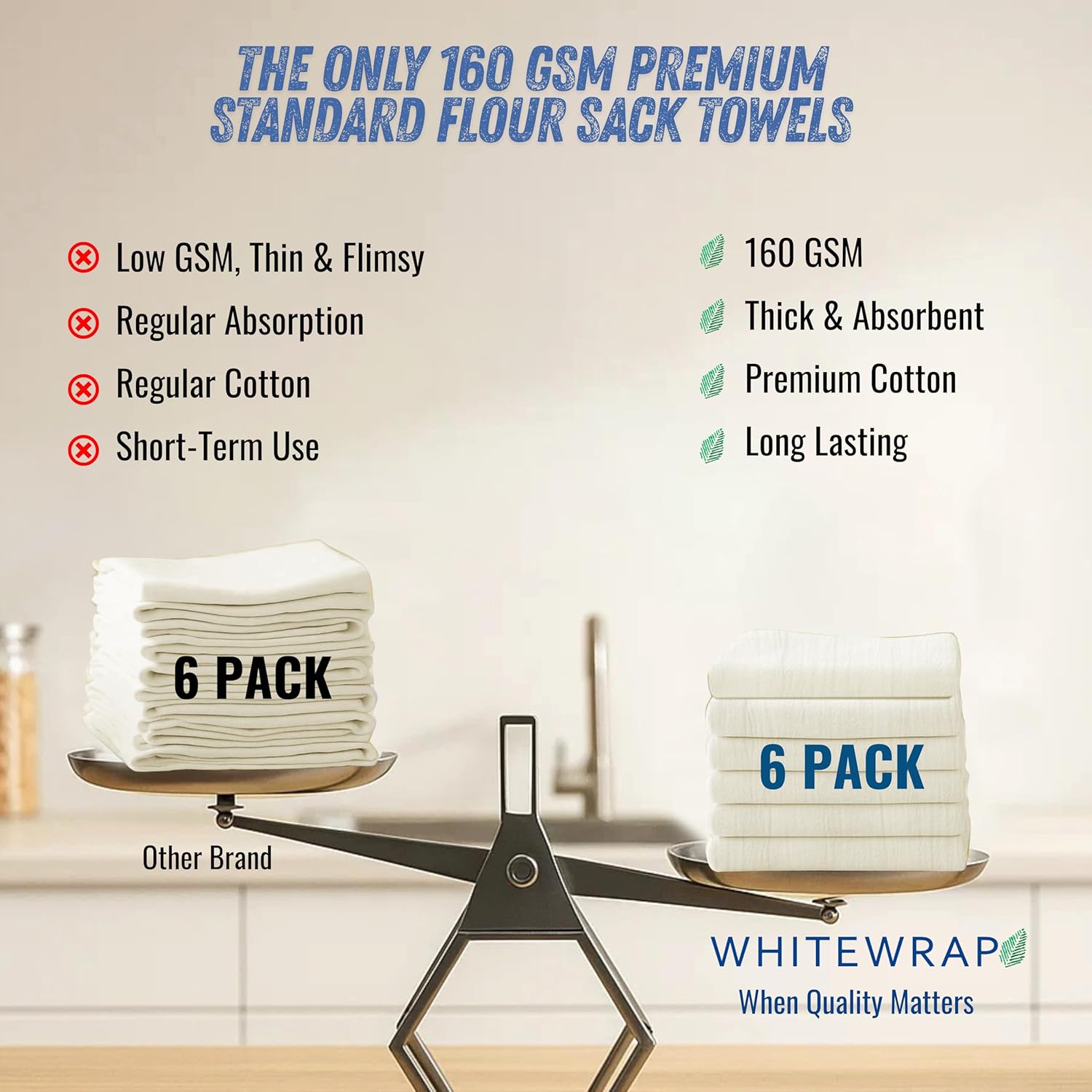 • ✅ Ultra-Thick 160 GSM Flour Sack Towels – Kitchen-Grade Absorbency Tired of thin, ineffective towels? WHITEWRAP’s high-density 160 GSM flour sack towels, made from 100% ring-spun cotton with a 130 thread count, offer exceptional thickness and ideal for drying dishes, wiping, and tough kitchen tasks.