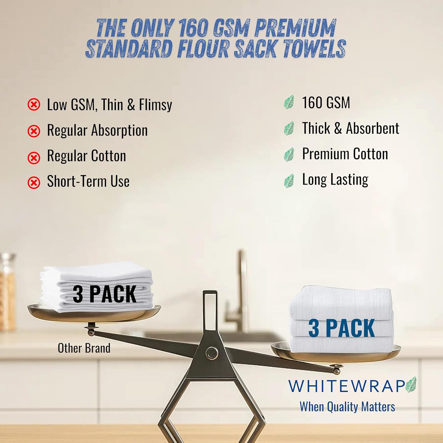 • ✅ Ultra-Thick 160 GSM Flour Sack Towels – Kitchen-Grade Absorbency Tired of thin, ineffective towels? WHITEWRAP’s high-density 160 GSM flour sack towels, made from 100% ring-spun cotton with a 130 thread count, offer exceptional thickness and ideal for drying dishes, wiping, and tough kitchen tasks.