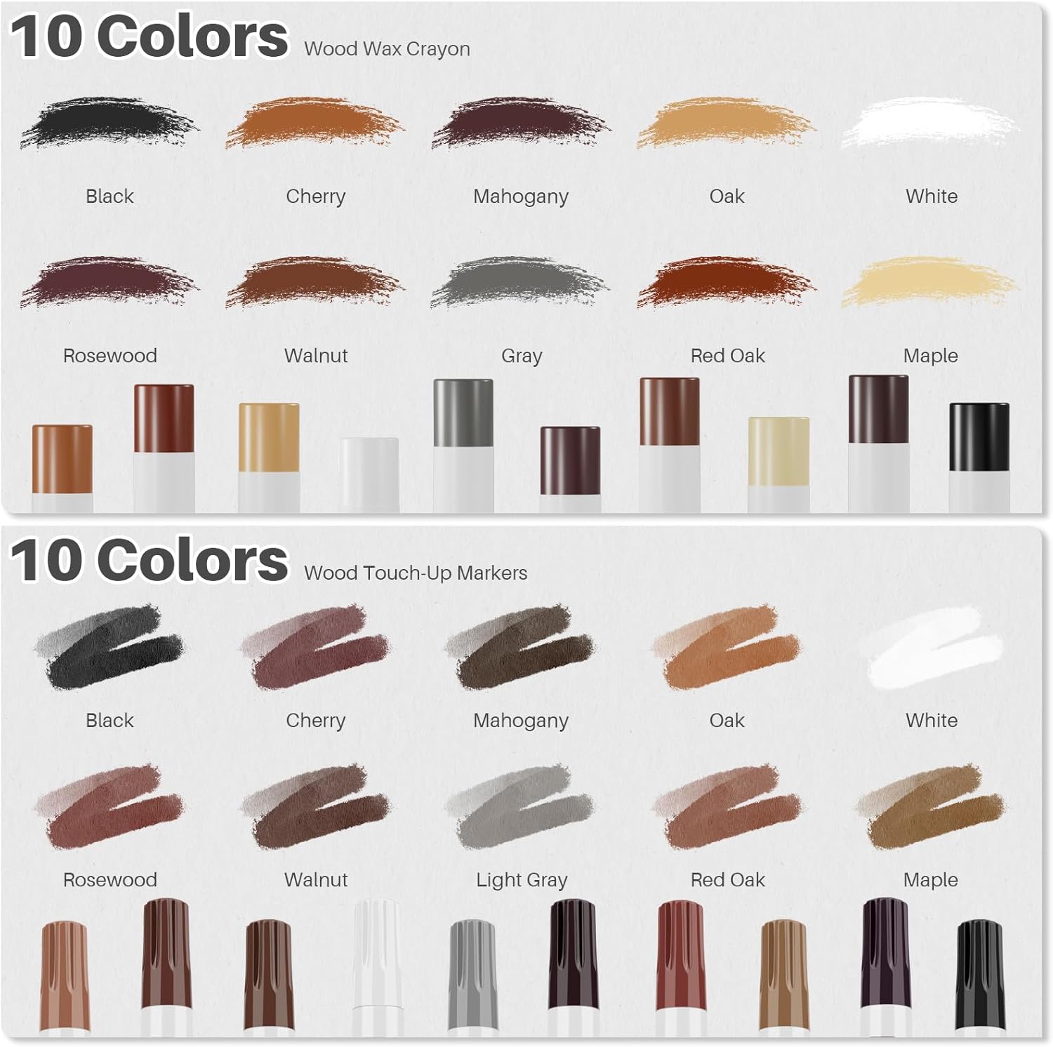 • Wide Range of Colors: Our wood filler sticks and wood repair markers are available in 10 colors: white, maple, oak, gray, cherry, red oak, mahogany, walnut, rosewood, and black. This variety of colors helps you find the perfect match for any wood surface, ensuring a seamless repair.