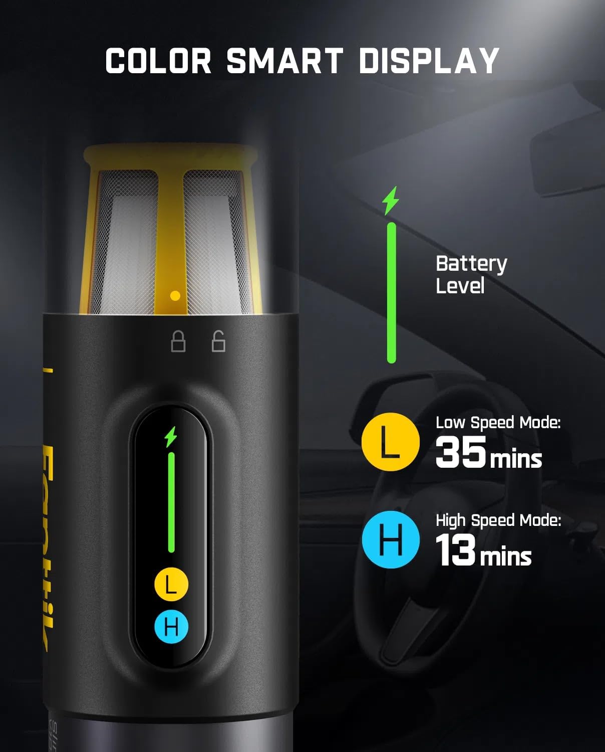 • Smart LED Display: This cordless car vacuum cleaner is equipped with a user-friendly LED display. With just a 1-second press, you can easily turn the device on or off. When you start it up, the display provides real-time updates on the battery level