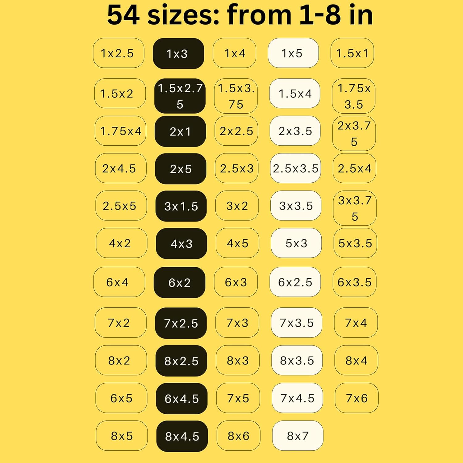 • 1.5x1 in stickers, 2x1 in, 3x1.5,3x2,4x2,4x3,5x3,6x4 in custom labels are available.