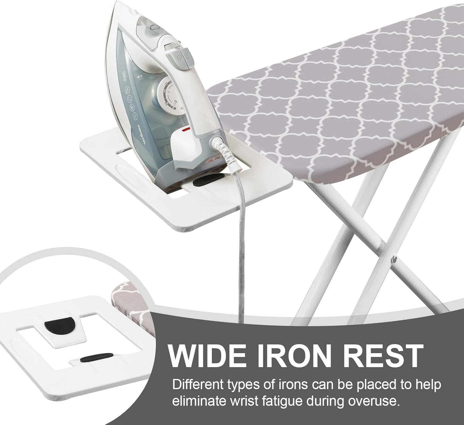 • Portable Iron Stand: Our iron board not only has a wide ironing surface of 39.4x13.4 inches, but also provides ample space for ironing various clothes. And it is also equipped with an iron stand, which can place the iron to better maintain good heat dissipation and help eliminate wrist fatigue during overuse.