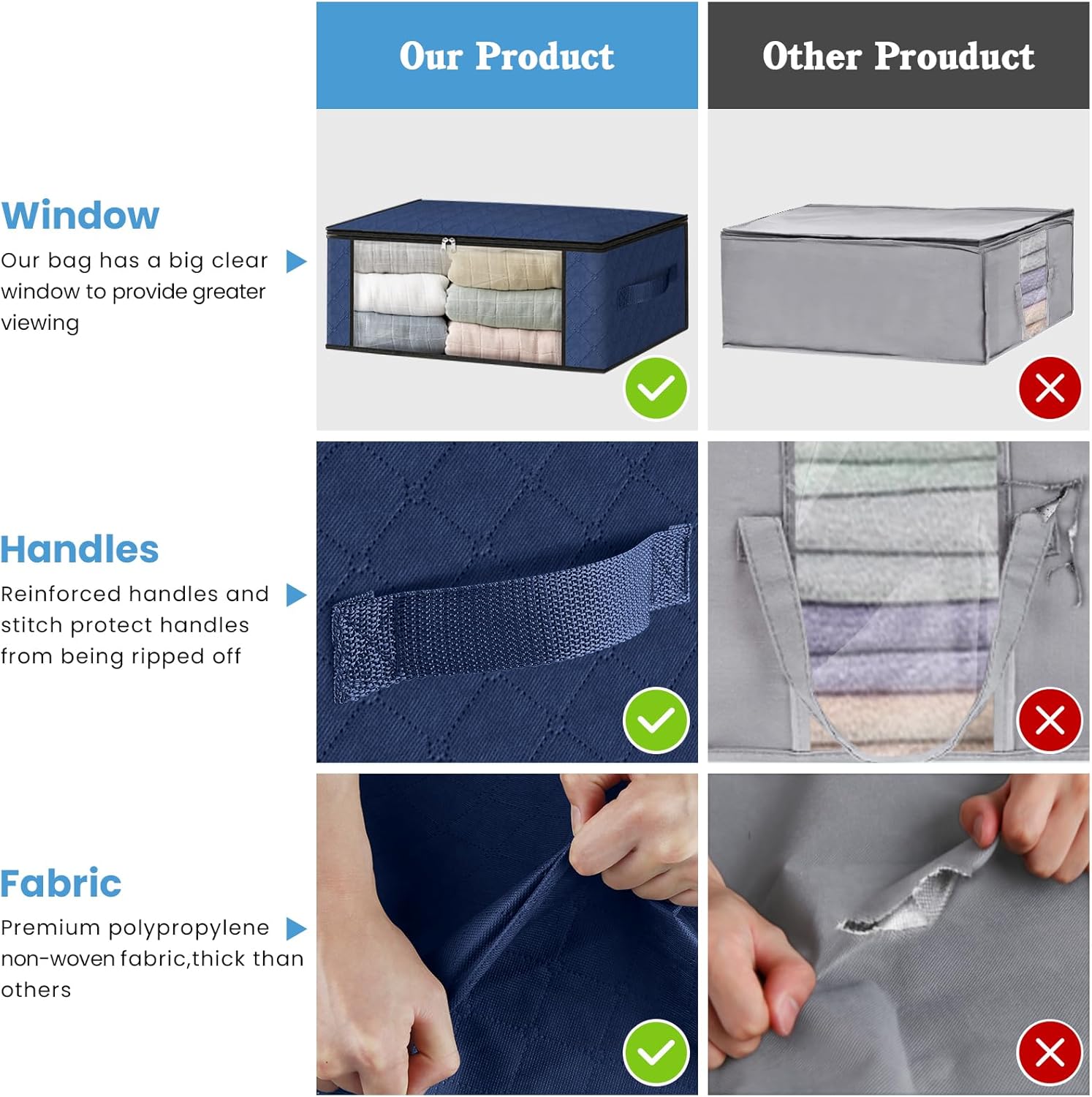 HomeHacks Storage 6-Pack Clothes Organizer Storage Bags Foldable Storage Box with Large Clear Window Sturdy Handles for Closet, Dorm, Pillows, Bedding, Clothes, Blankets, 35L, Blue