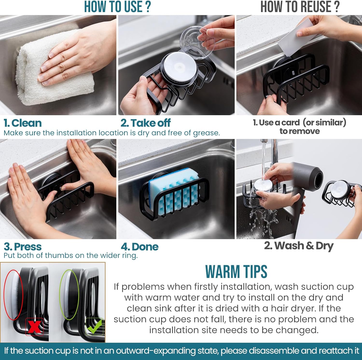 • [1 Second Installation & Removable]: Simply press down the suction cup to squeeze the air out, they will stick to the wall firmly. You can finish the installation in 1 second. No screws, no nails, no glue, no tools. The kitchen sink caddy can be re-positioned many times and removed without leaving residues (If problems when firstly installation, wash suction cup with warm water and try to install on the dry and clean sink after it is dried with a hair dryer. If the suction cup does not fall, there is no problem and the installation site needs to be changed.)