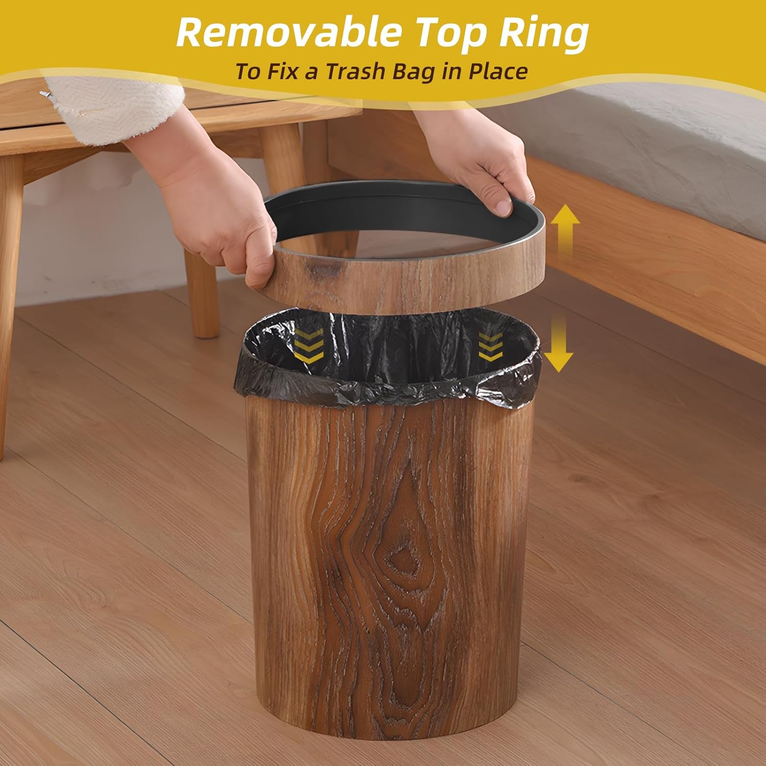 Wood Grain Plastic Trash Can Bedroom, Round 2-Pack, 3.4 Gal Farmhouse Wastebasket Bin Retro Style, Brown Trash Can for Room Aesthetic, Open Top Garbage Can for Office, Living Room, Hotel, Bathroom
