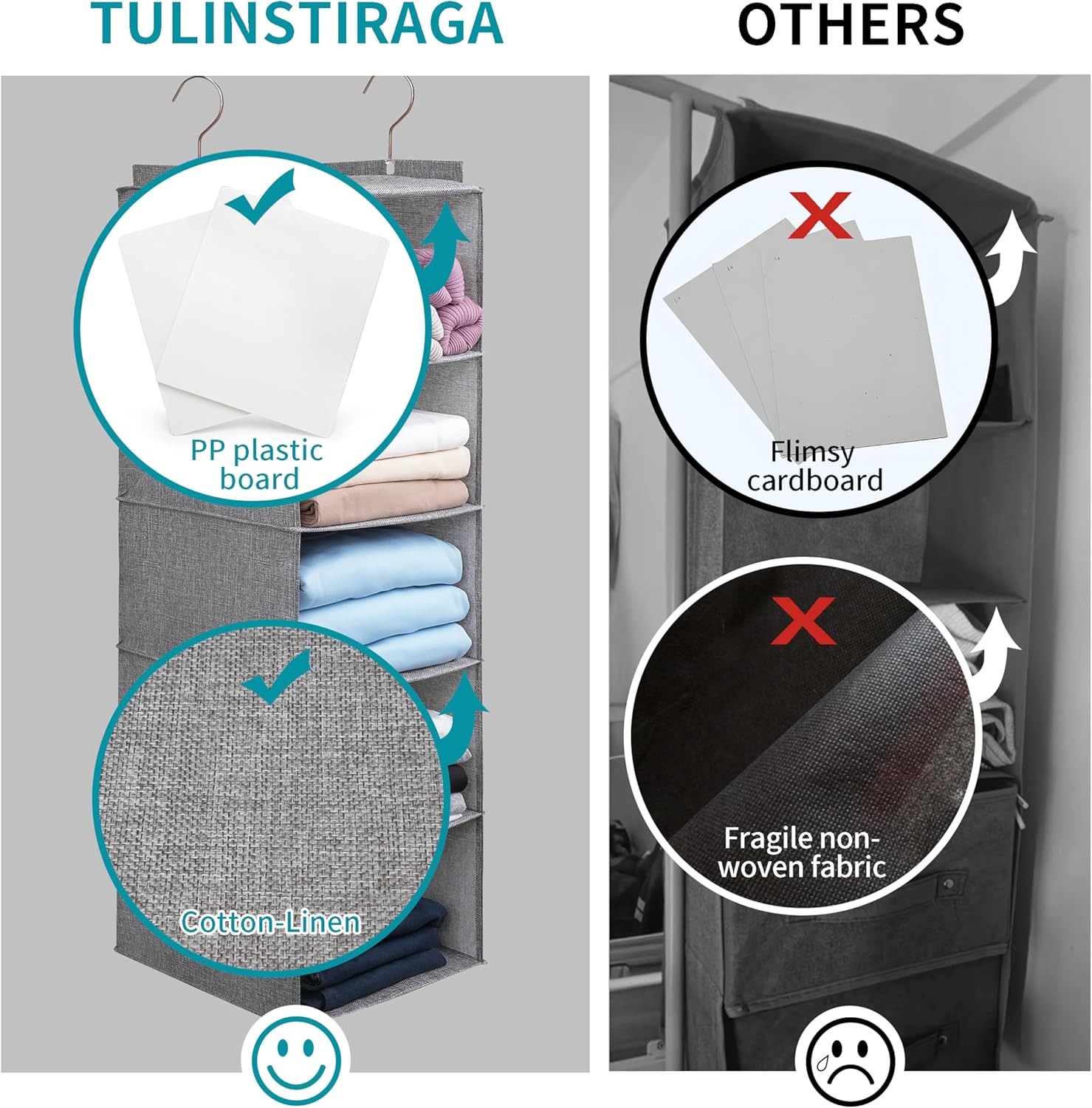 • The foldable design of this hanging closet organizer allows for easy storage and transport, making it perfect for small spaces, dorm rooms, and travel.