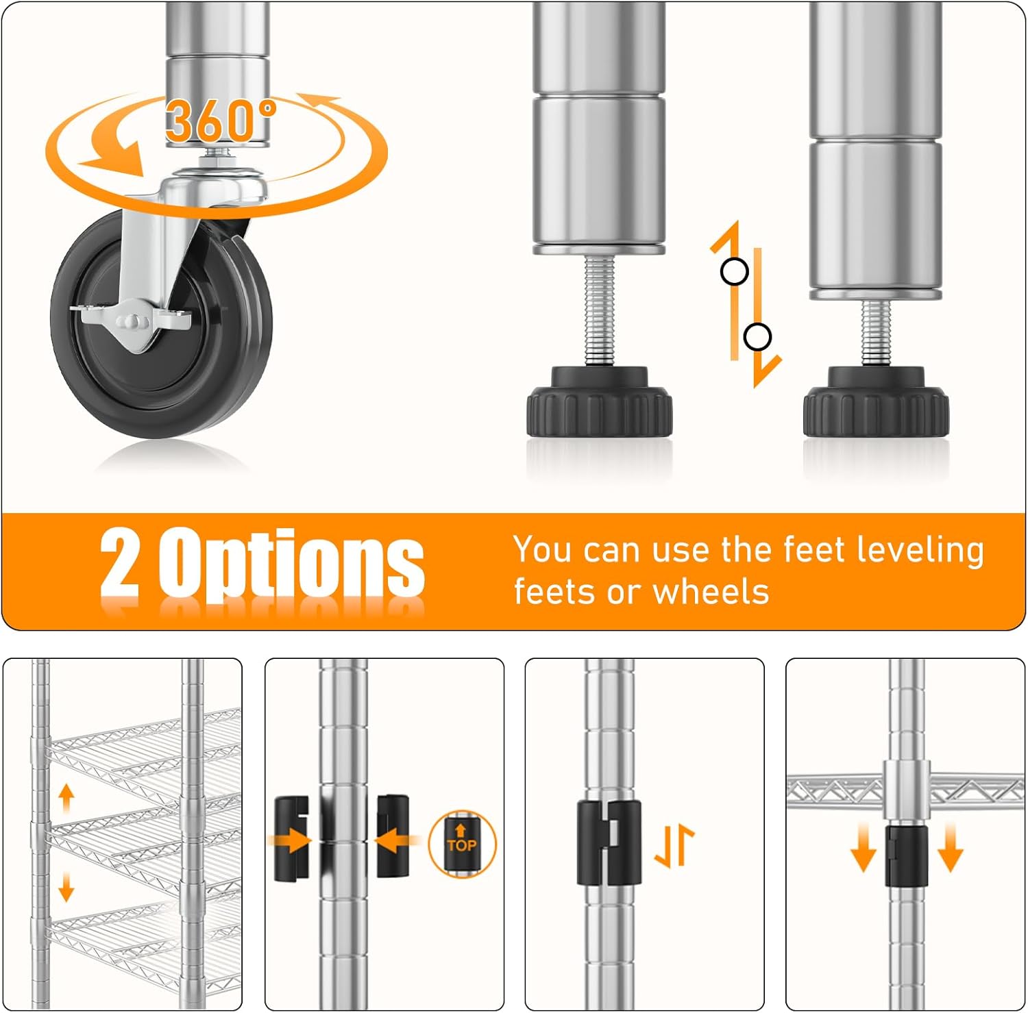 • 【ADJUSTABLE HEIGHT】Each layer of the wire shelf can be adjusted to match the height of your items, optimizing your storage space. Additionally, you can join two storage racks to form a wider unit, providing extra width to meet your needs. No matter your requirements, you can assemble a shelf configuration that fits just right