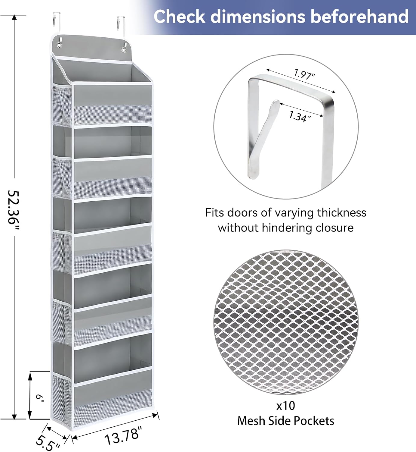• TOP EASY INSTALLATION: Our Over Door Organizer can be effortlessly installed without any tools. With three width adjustable metal hooks, making this over the door storage organizer universally fits for most of the doors less than 1.98" thick. What you need to do , is just put the hooks onto the door without making holes on the door