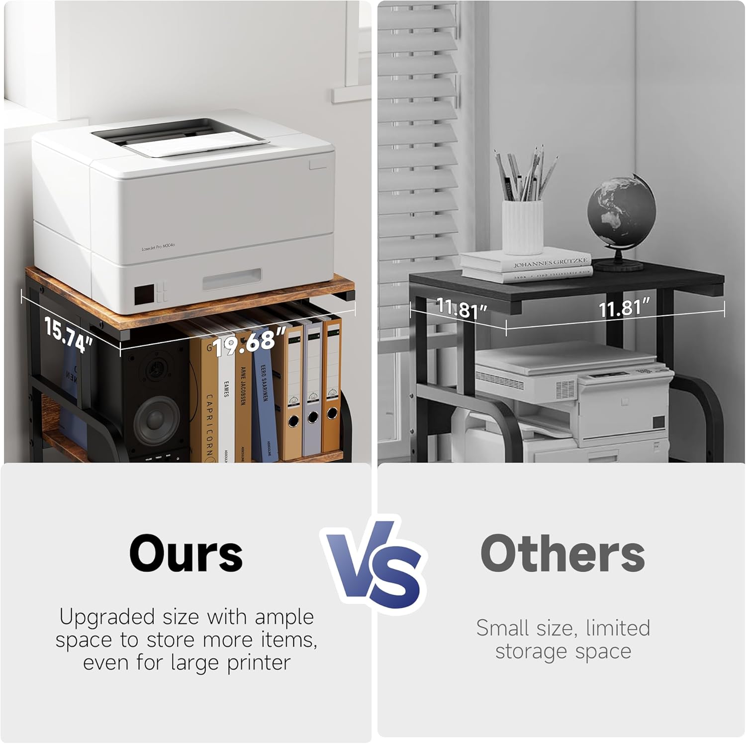 • 【Customizable Height for Versatile Storage】 Transform your compact workspace with 5-level adjustable height (9.45" range) on the middle shelf! Perfectly adapt for bulky laser printers, 3D printer stands, or mini fridge stands by tailoring tier spacing. Measuring 19.68”Wx15.75”Dx27.55”H, this space-saving printer table for home office maximizes vertical storage without sacrificing mobility. Industrial steel frame and 110 lb/shelf capacity ensure wobble-free stability even during high-volume printing. Optimize tight spaces as a mobile printer cart or under desk printer stand!