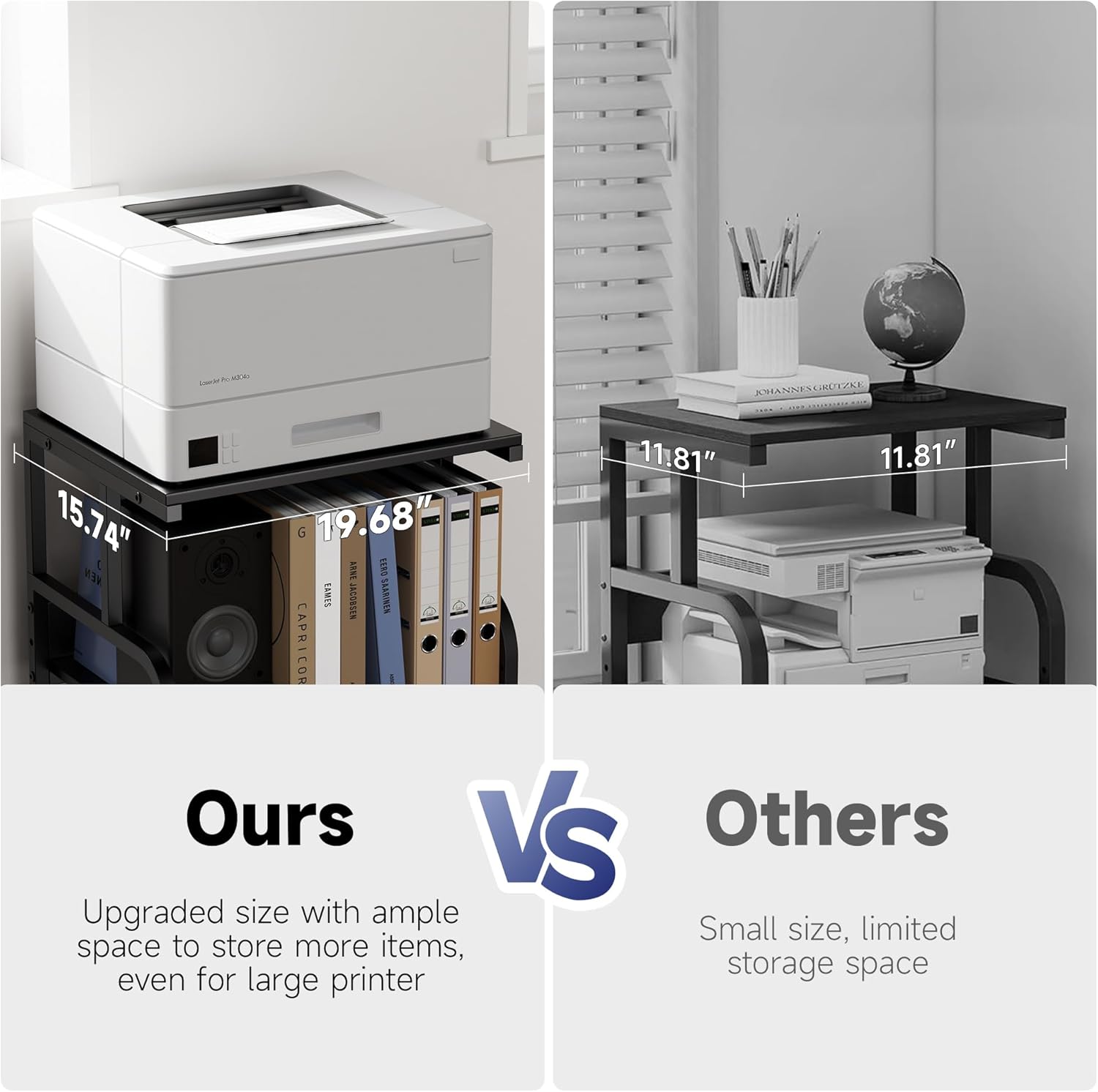 • 【Customizable Height for Versatile Storage】 Transform your compact workspace with 5-level adjustable height (9.45" range) on the middle shelf! Perfectly adapt for bulky laser printers, 3D printer stands, or mini fridge stands by tailoring tier spacing. Measuring 19.68”Wx15.75”Dx27.55”H, this space-saving printer table for home office maximizes vertical storage without sacrificing mobility. Industrial steel frame and 110 lb/shelf capacity ensure wobble-free stability even during high-volume printing. Optimize tight spaces as a mobile printer cart or under desk printer stand!