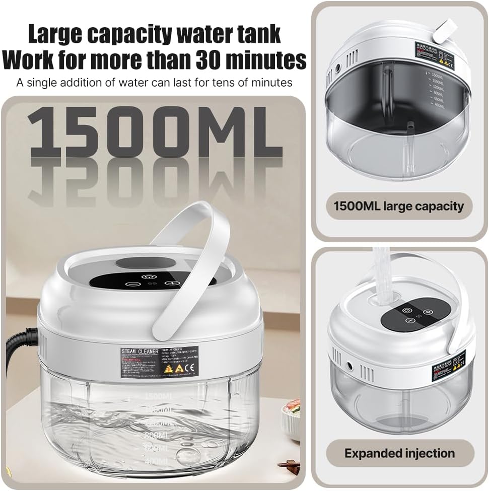 • Large Capacity: Portable steam cleaner with a large water tank of 1500ml capacity and large water inlet which allows you to focus on cleaning, instead of refilling often.