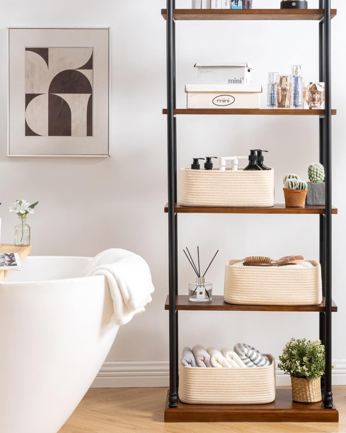 • [ Elegantly Designed to Match Any Décor ] Our small rope basket creates a minimalist appearance, and it adds a touch of warmth and texture to any room. The classic solid color design ensures seamless integration with your existing aesthetics, complementing any decoration. Perfect as decorative storage baskets for shelves, cabinets, and any open display space, making them a stylish and practical addition to any decor, enhancing the overall aesthetics of your room